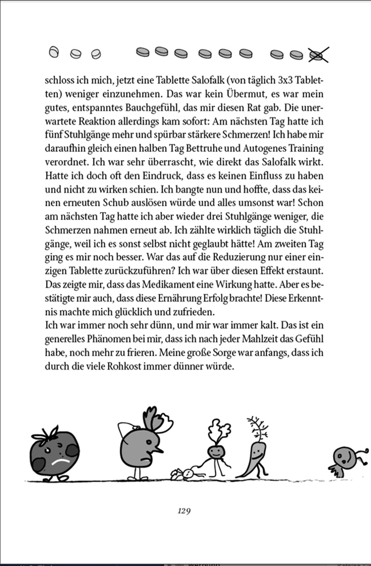 Einige Worte vorweg Sieben lange Jahre litt ich an der Krankheit Colitis ulcerosa, sieben lange Jahre bestimmte diese Krankheit mein Leben und das meiner Familie, sieben lange Leidensjahre musste ich überstehen, ehe ich durch Disziplin und Nahrungsumstellung in mein altes Leben zurückfand. Ich habe mir die Krankheit nicht ausgesucht. Sie war ein ungebetener Eindringling, der zunehmend mehr darüber entschied, wie mein Alltag auszusehen hatte. Was ist eigentlich Colitis ulcerosa? Es handelt sich dabei um eine chronisch entzündliche Darmerkrankung. Sie verläuft meist in Schüben und wird von starken Blutungen und Schmerzen begleitet. Die Krankheit gilt in der Schulmedizin als nicht heilbar. Warum schreibe ich dieses Buch? Ich habe für mich, nach schweren Krankheitsjahren, Wege gefunden, Wege, heraus aus meinem Albtraum. Seitdem kann ich beschwerdefrei, und ohne Medikamente einzunehmen, leben. Immer wieder werde ich von Betroffenen, die unter dieser Krankheit leiden und auf der Suche nach einem Ausweg sind, um Hilfe gebeten. Deshalb begann ich, meine Erfahrungen aufzuschreiben. Ich nehme Sie gern mit auf die nun entstandene Reise. Ich bin überzeugt, viele Hinweise können anderen helfen. Voraussetzung dafür ist allerdings, man begibt sich auf seinen ganz persönlichen Weg, um die Ursachen zu entdecken und ist bereit, vieles in seinem Leben zu ändern. Jedes Leben und jede körperliche Konstitution ist eine andere. Deshalb sind meine Erfahrungen nicht eins zu eins auf andere übertragbar. Auch die Dauer und die Schwere der Erkrankung spielen eine Rolle. Ich bin mir aber sicher, dass eine Besserung des Krankheitsbildes erreichbar ist. Denn ich habe auf meinem Weg bereits viele Menschen kennengelernt, denen das ebenfalls gelungen ist.