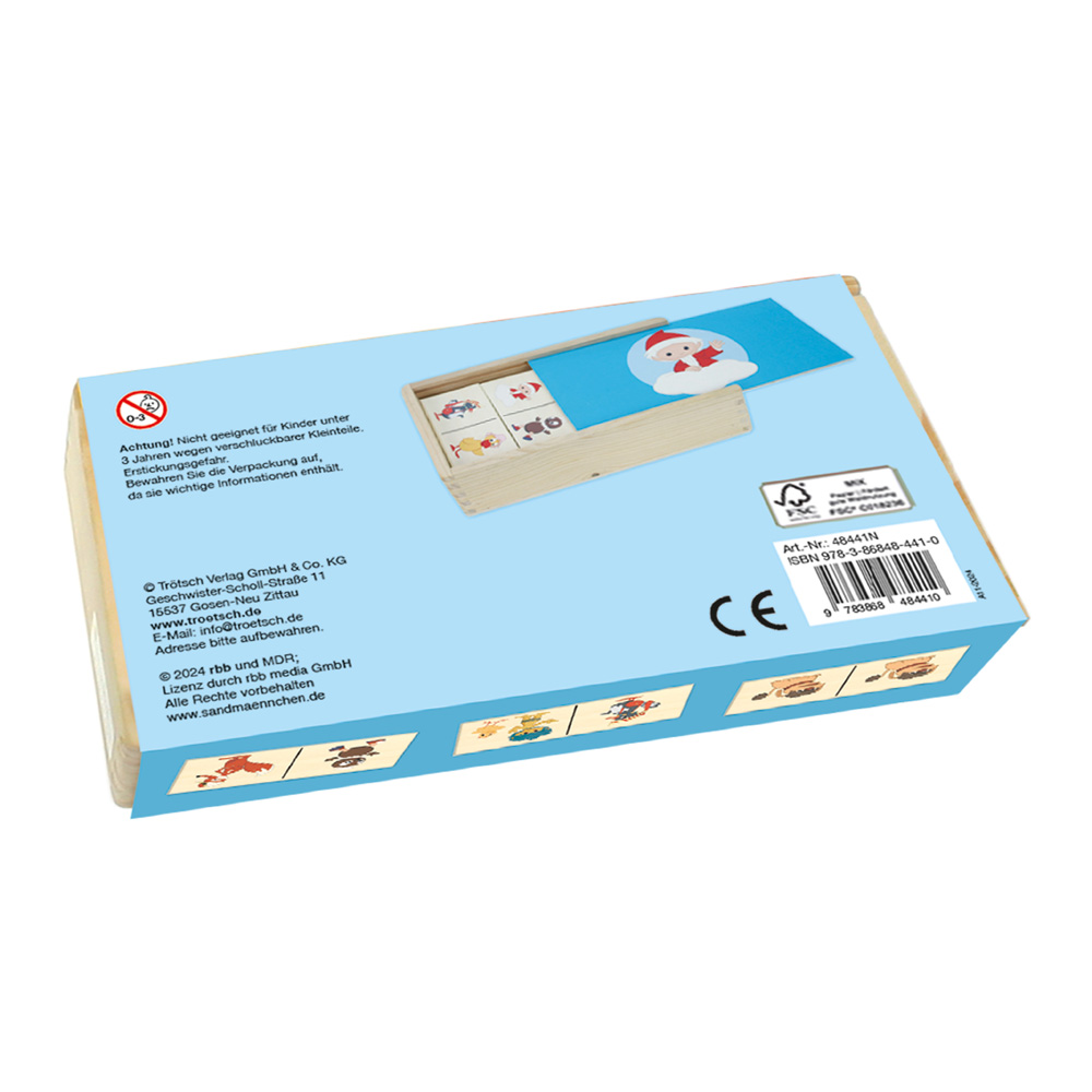 | Schlagworte | Bilderbücher • Domino • Domino-Spiele (Nonbooks) • Frühe Kindheit / Frühkindliche Bildung • Holz • Interaktive Bücher, Mitmachbücher • Kinderspiele (Nonbooks) • Legespiele (Nonbooks) • Lernen • Sandmann • Sandmännchen • Sandmännchen (Nonbooks) • Spielen • Spiele (Nonbooks) |