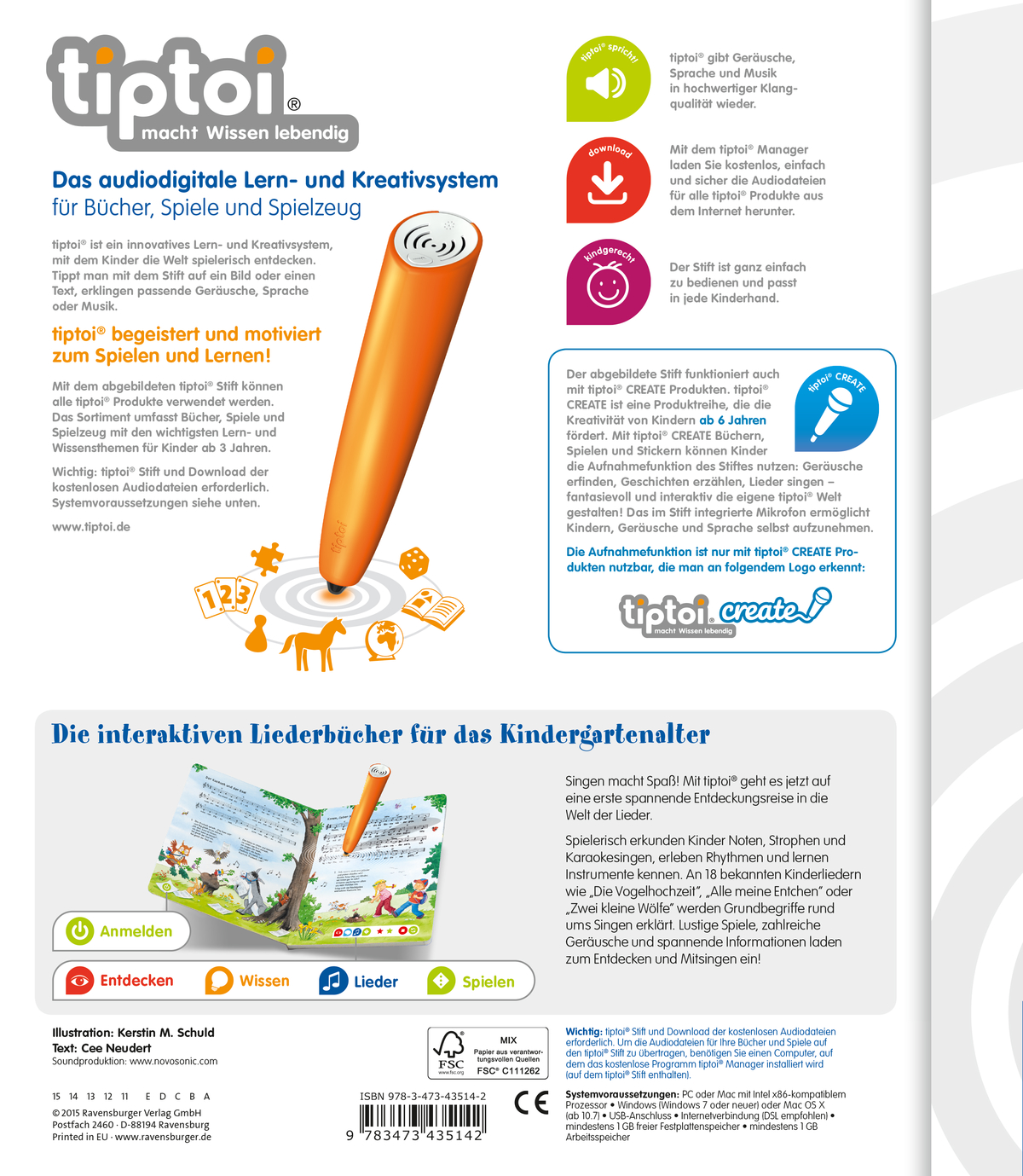 Mit 18 der bekanntesten und schönsten Kinderlieder von "Alle meine Entchen" über "Wer will fleißige Handwerker seh‘n" zu "Die Affen rasen durch den Wald" führt tiptoi® in die Welt der Lieder ein. Kinder können sich sowohl die kompletten Lieder als auch einzelne Strophen vorspielen lassen. Eine zusätzliche Playbackversion lädt auf jeder Seite zum Selbersingen ein. Was ist eine Note, Strophe oder Tonleiter? Wie funktioniert ein Kanon? Nebenbei vermittelt das tiptoi® Liederbuch erstes Sachwissen zum Thema Musik.
