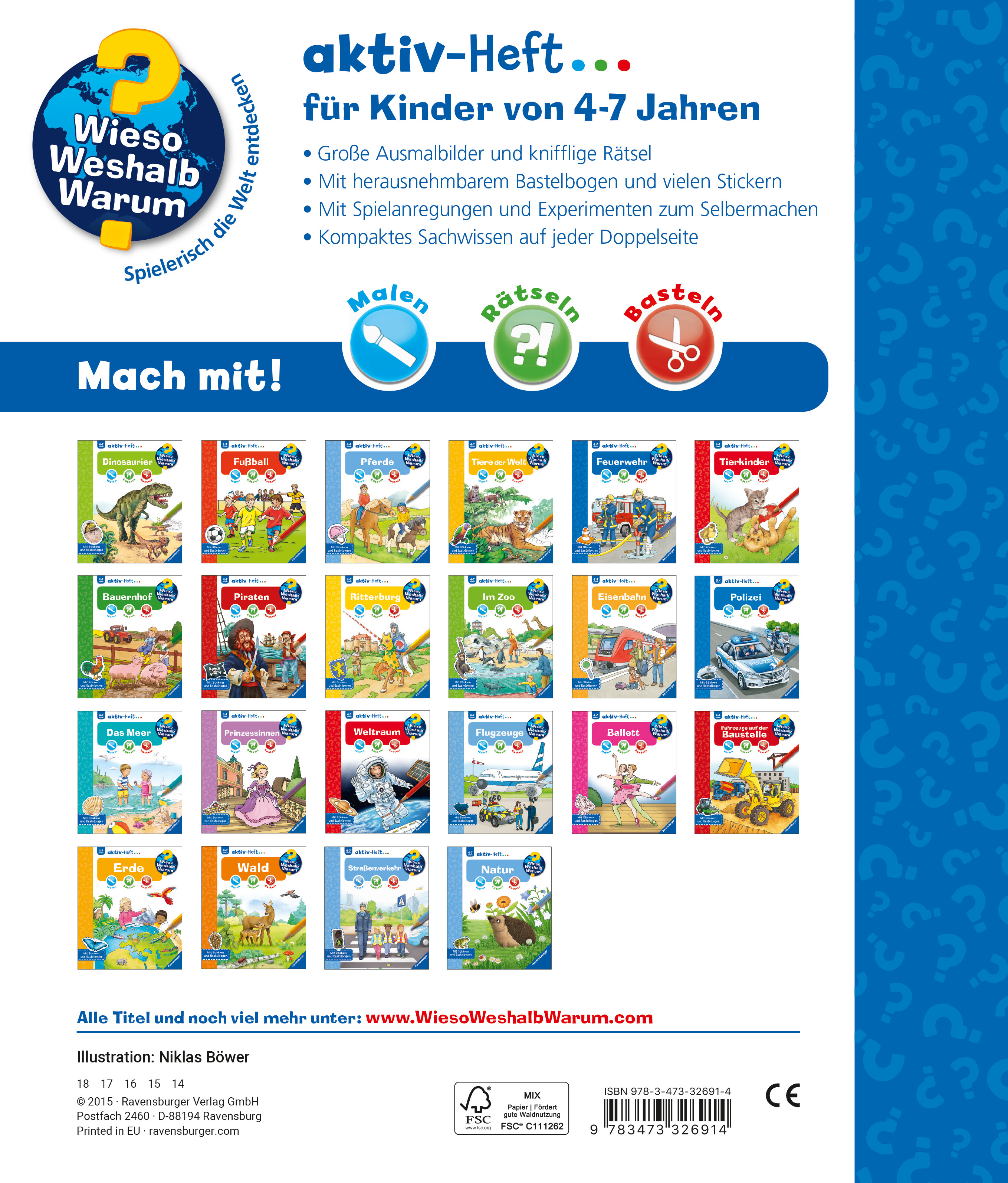 Mit den Wieso Weshalb? Warum? aktiv-Heften erschließen Kinder sich ihre Lieblingsthemen selbstständig. Große Bilder laden zum Ausmalen ein. Kurze, kindergerechte Texte vermitteln Sachwissen, das durch abwechslungsreiche Rätsel auf spielerische Weise vertieft wird. Einfache Experimente und vielfältige Spielanregungen sorgen für viel Spaß. Darüber hinaus laden Bastelideen und Sticker Kinder dazu ein, selbst kreativ zu werden.