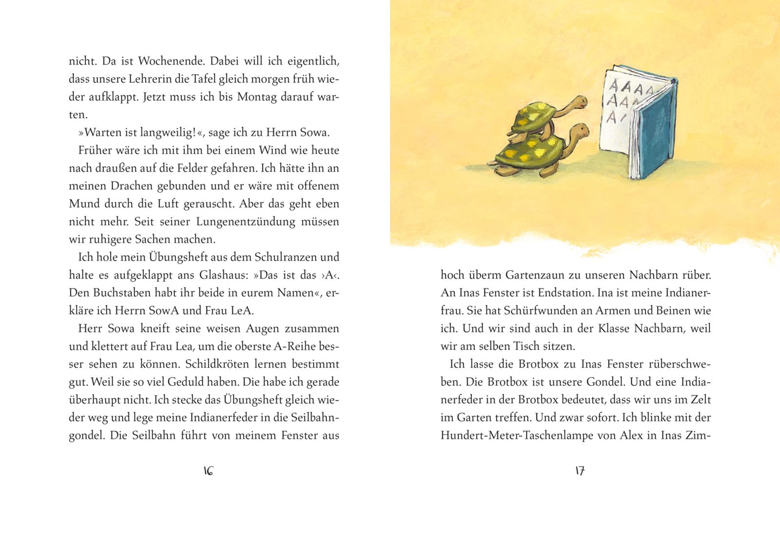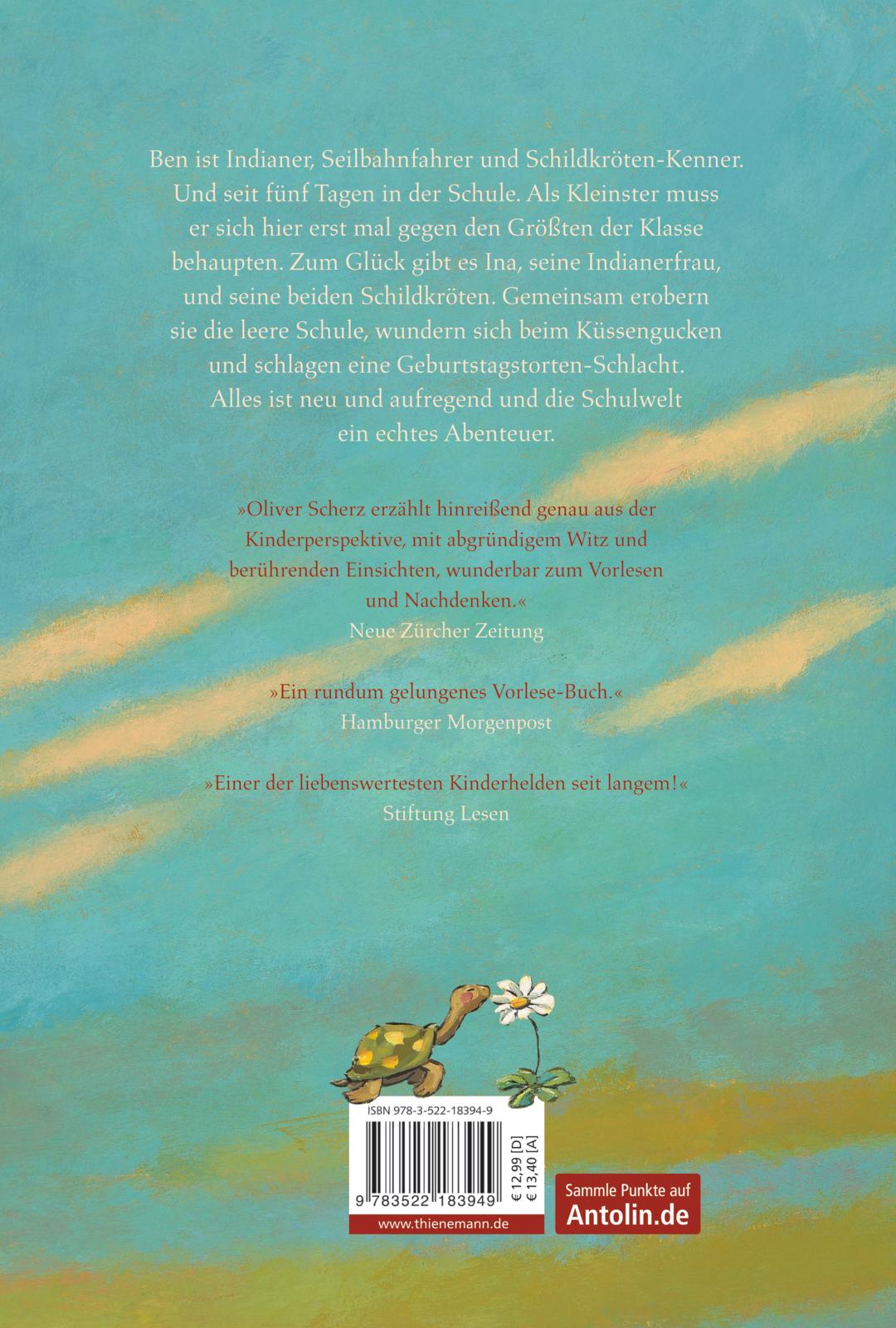 Ben ist Indianer, Seilbahnfahrer und Schildkröten-Kenner. Und seit fünf Tagen in der Schule. Als Kleinster muss er sich hier erst mal gegen den Größten der Klasse behaupten. Zum Glück gibt es Ina, seine Indianerfrau, und seine beiden Schildkröten. Gemeinsam erobern sie die leere Schule, wundern sich beim Küssengucken und schlagen eine Geburtstagstorten-Schlacht. Alles ist neu und aufregend und die Schulwelt ein echtes Abenteuer.