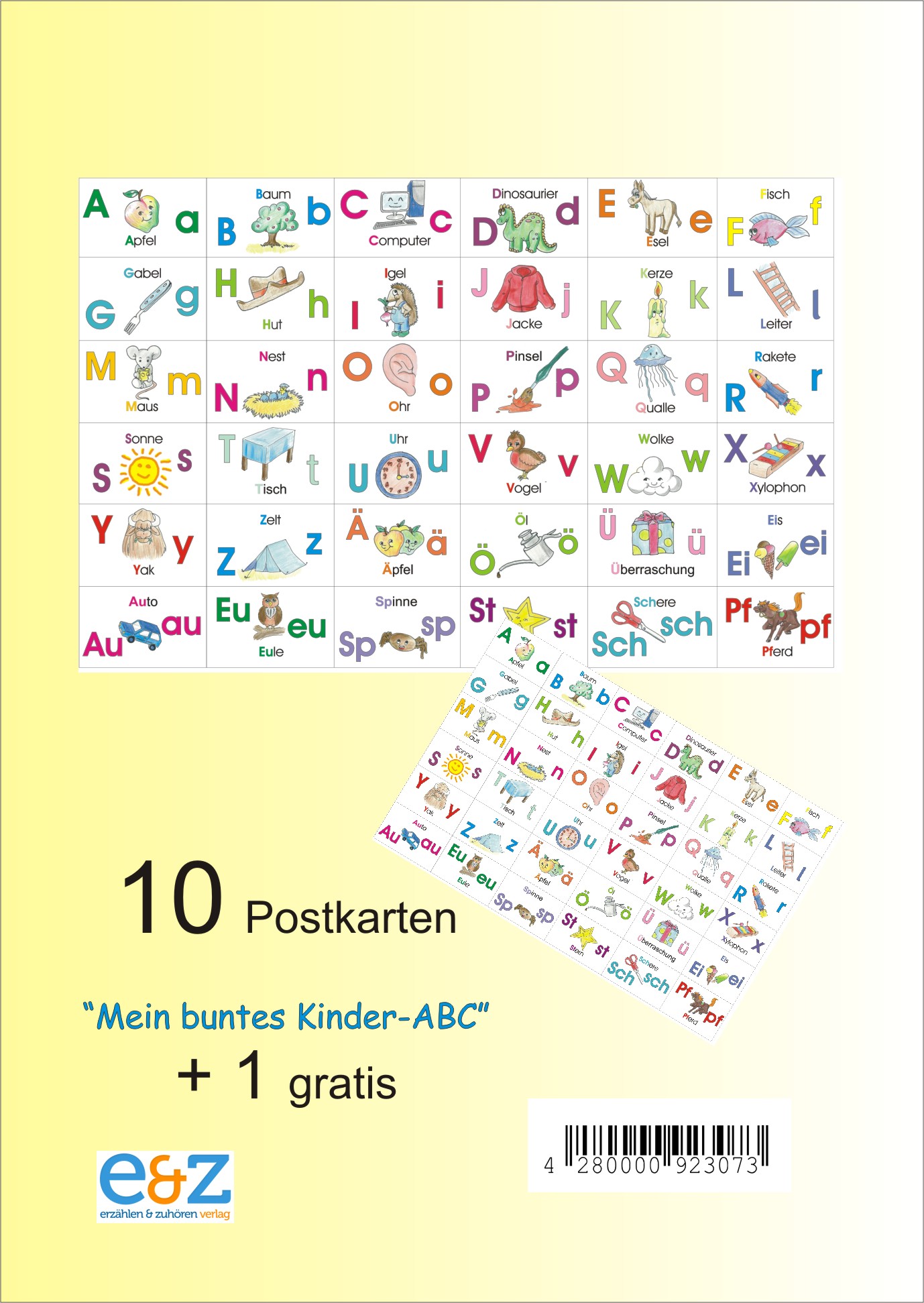 Diese Postkarte ist nicht nur etwas für Kinder. Es ist nicht nur eine Postkarte - sondern auch eine Lernkarte. Kinder lernen das ABC in Groß- und Kleinbuchstaben mit Umlauten kennen. Als Poster in 70 x 100 cm "Mein buntes Kinder-ABC" ebenfalls erhältlich (ISBN: 978-3-938573-41-9).