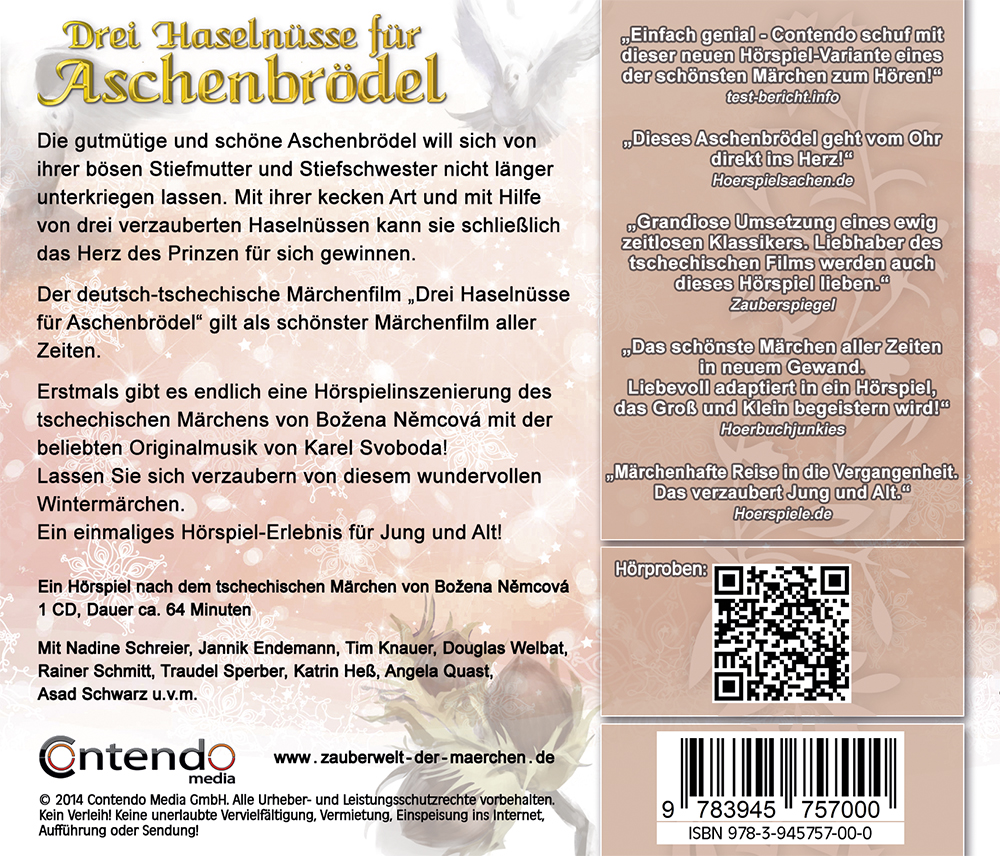 "Mit der ersten Folge der neuen Hörspielserie „Zauberwelt der Märchen“, haben die Macher den erfolgreichen Versuch unternommen einen in die Jahre gekommenen Kultfilm rechtzeitig zur Weihnachtszeit in ein schwungvolles und unterhaltsames Hörspielerlebnis für die gesamte Familie umzuwandeln. „Drei Haselnüsse für Aschenbrödel“ ist dank der professionellen Umsetzung weit mehr als nur die Hörspielfassung des 70er Jahre Klassikers für Nostalgiker. Vielmehr handelt es sich um das perfekte Geschenk, um die ganze Familie unterm Weihnachtsbaum für eine gute Stunde in die zauberhafte Welt der Märchen zu entführen."