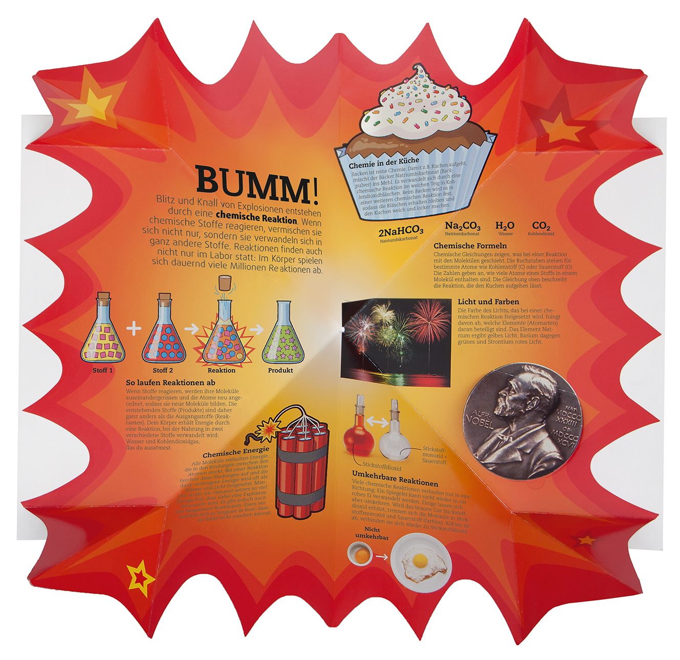 Versuch macht klug! Die verrückte Welt der Wissenschaft entdeckt man am besten durch Ausprobieren. In diesem Buch sind Physik und Chemie alles andere als trocken, denn hier wird naturwissenschaftliches Know-how auf unkonventionelle Weise vermittelt. Interaktive Elemente wie Klappen, Pop-ups, Schiebeelemente und weitere Extras veranschaulichen komplexe Zusammenhänge und machen sie leicht begreifbar. Anhand eines riesigen dreidimensionalen Atoms lernen Kinder, dass unsere ganze Welt aus vielen winzigen Teilchen besteht. Genauso spannend ist das Prinzip, nach welchem Maschinen funktionieren. Eine Dreh-Animation im Buch macht es leicht verständlich und Kinder werden staunen, dass sich auf diese Weise sogar schwere Autos und Lokomotiven in Bewegung setzen.