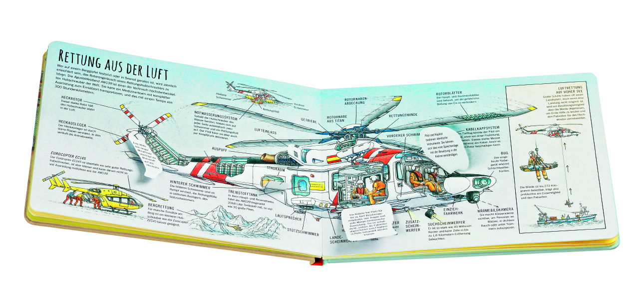 Meisterillustrator Stephen Biesty stellt in diesem Sachbuch die modernsten Rettungsfahrzeuge der Welt vor; zahlreiche Klappen eröffnen Blicke in verborgene Details.