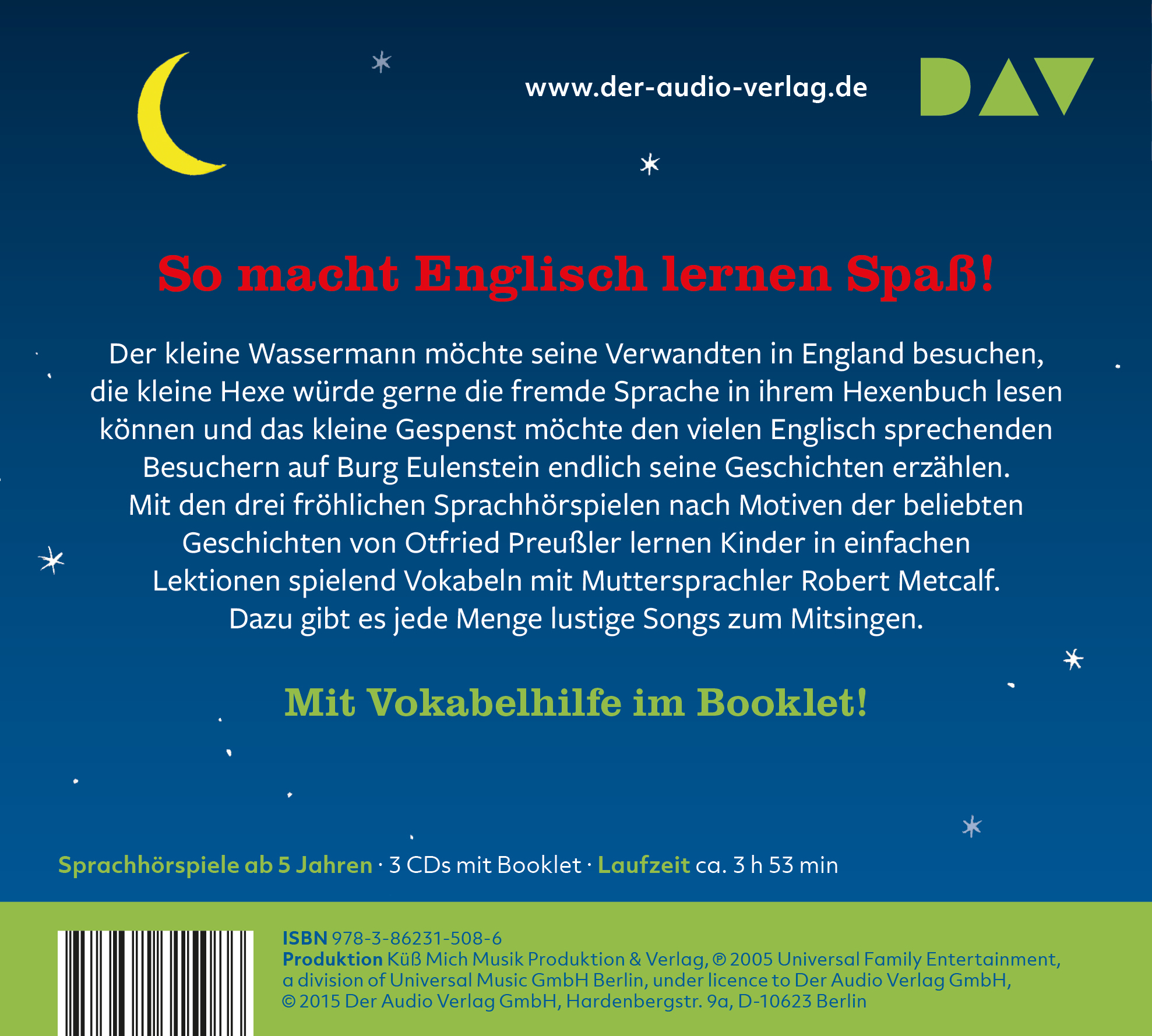 | Schlagworte | Aussprache • England • Englisch • Englisch; Audio-CDs für Kinder • Fremdsprache • Fremdsprachenerwerb • Gespenst • Hexe • Hörbuch; Hörspiel für Kinder/Jugendliche • Hörspiel • Kinder • Klassiker • Lernen • Mitsingen • Musik • Preußler • Sprache • Sprachkurs • Vokabeln • Wassermann • Wortschatz |