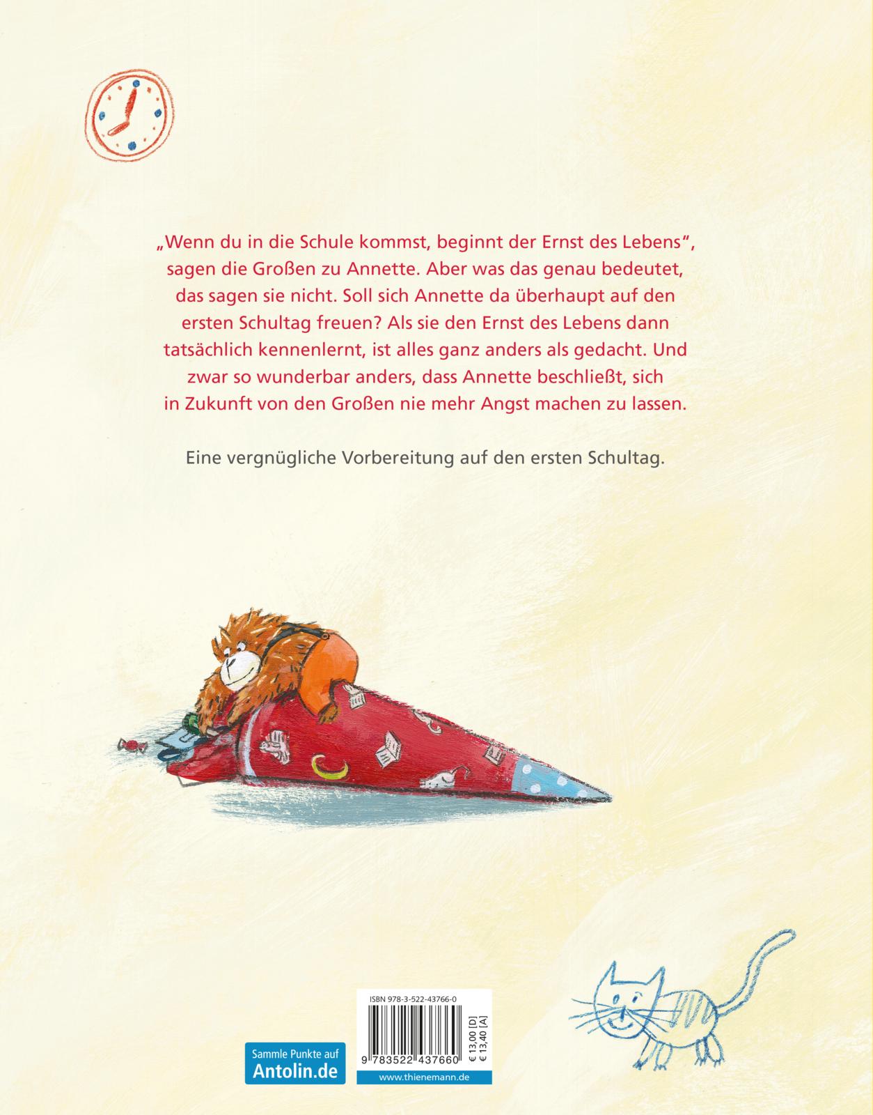 "Wenn du in die Schule kommst, beginnt der Ernst des Lebens", sagen alle zu Annette. Wie der wohl aussieht? Und wie soll sie sich da noch auf ihren ersten Schultag freuen? Doch dann kommt alles ganz anders und Annette beschließt, sich in Zukunft keine Angst mehr von den Großen machen zu lassen. Eine vergnügliche Vorbereitung auf den ersten Schultag.
