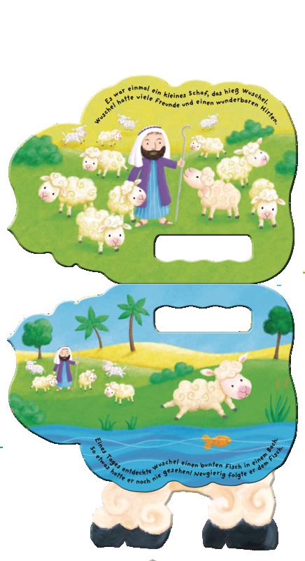 Das beliebteste Tier der Bibel mit praktischem Tragegriff und beweglichen Beinen - und mit der biblischen Geschichte vom verlorenen Schaf auf den stabilen Innenseiten!"Es war einmal ein kleines Schaf, das hieß Wuschel. Wuschel hatte viele Freunde und einen wunderbaren Hirten. Eines Tages ..."Wie es mit guten Hirten und dem verlorenen Schaf weitergeht, können Kinder hier entdecken. Schon die Kleinsten dürfen sicher sein: Gott passt auf dich auf wie der gute Hirte auf seine Schafe. Für besonderen Spaß sorgen die federnden Beine des Schafs, mit denen man es hüpfen lassen kann.