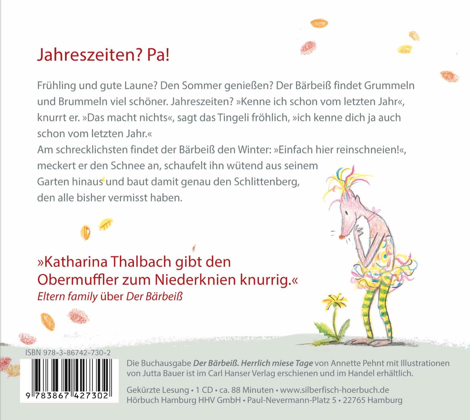 Frühling und gute Laune? Den Sommer genießen? Im Herbst etwas unternehmen? Im Winter Schlitten fahren? Der Bärbeiß findet grummeln und brummeln viel schöner. Jahreszeiten, pa! »Kenne ich schon vom letzten Jahr«, knurrt der Bärbeiß. »Das macht nichts«, sagt das Tingeli fröhlich, »ich kenne dich ja auch schon vom letzten Jahr.« Den Frühling kann der Bärbeiß nicht aufhalten, auch wenn er schimpfend die ersten Krokusse ausrupft. Das Tingeli sorgt dafür, dass den Bewohnern von Timbuktu immer neue Unternehmungen einfallen. In den großen Ferien: Sommerschule oder lieber Urlaub? Im Herbst: Drachen steigen lassen oder selber fliegen? »Komische Idee«, mault der Bärbeiß. Am schrecklichsten aber findet er den Winter: »Einfach hier reinschneien!«, meckert er den Schnee an, schaufelt ihn wütend aus seinem Garten hinaus und baut damit genau den Schlittenberg, den alle bisher vermisst haben.