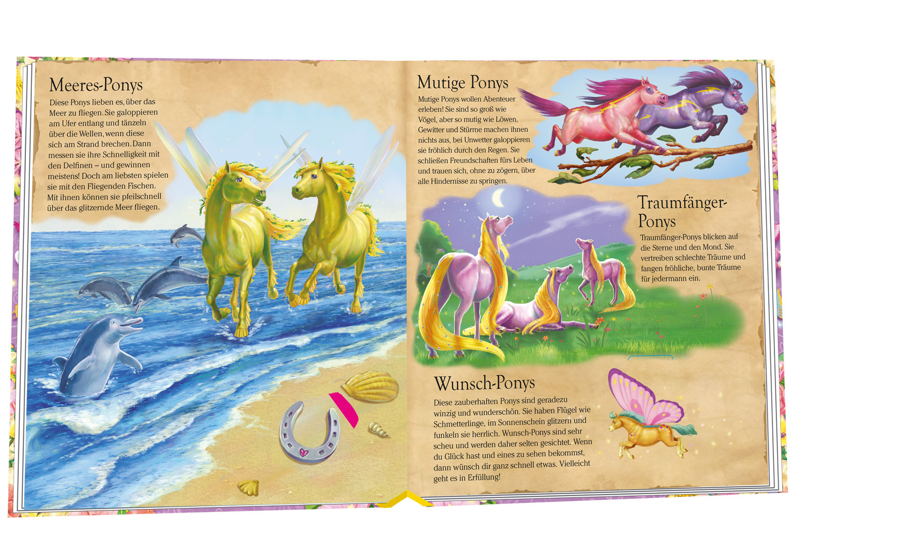 Zauberhafte Ponys, soweit das Auge reicht – Mit diesem Abenteuerbuch betreten Kinder die magische Welt der kleinen Pferde. Auf jeder Seite wartet nicht nur eine neue Überraschung sondern auch Wissenswertes über das Leben der verschiedenen Ponys.