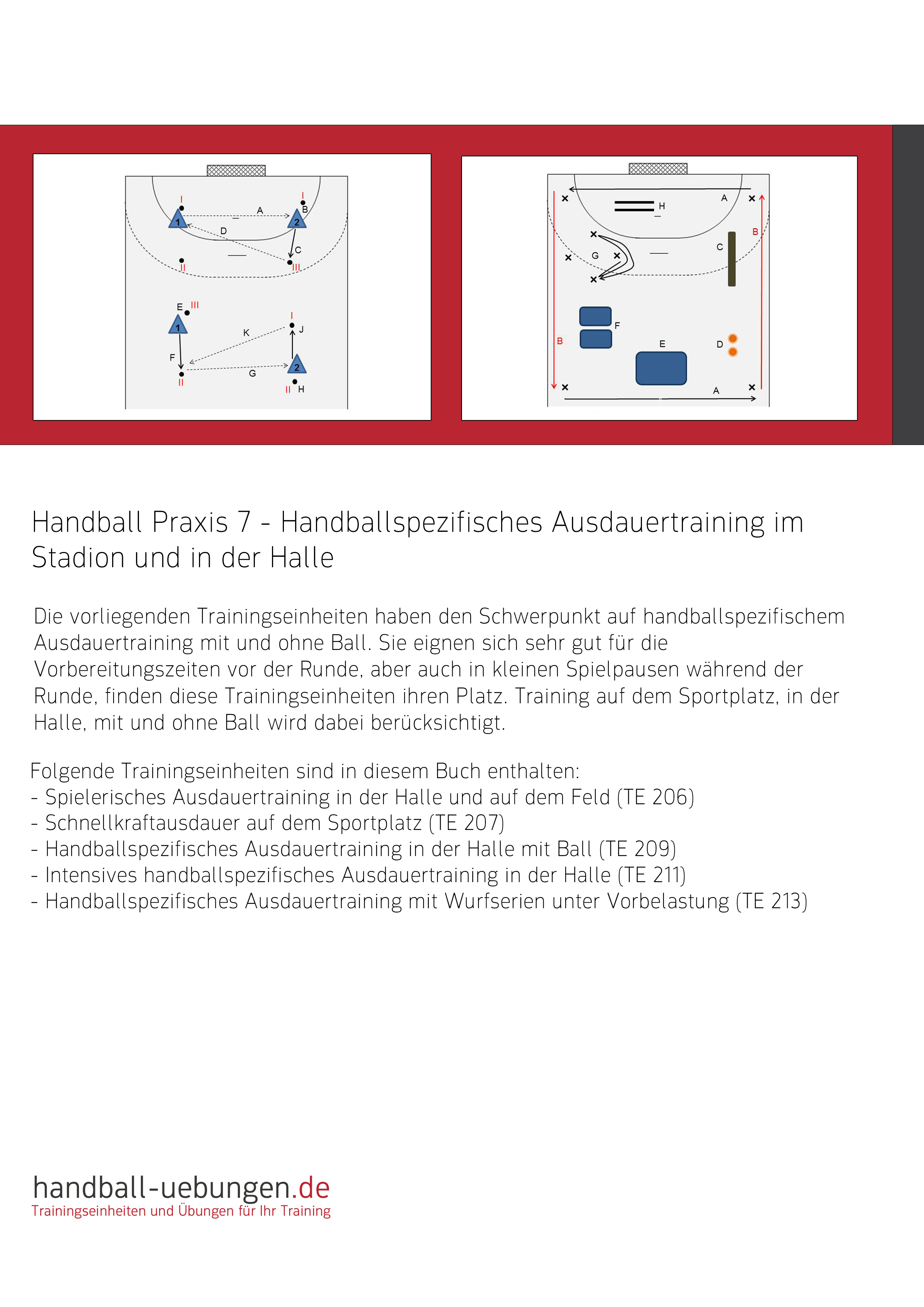 Der Schwerpunkt dieser Trainingseinheit liegt im handballspezifischen Ausdauertraining. Nach der Erwärmung und einem Sprintspiel folgt eine Laufübung, die unterbrochen ist durch mathematische Aufgabenstellungen, die im Team gelöst werden müssen. Nach einer Zwischenübung zur Ballkoordination startet ein Parcours mit sieben Stationen, der zweimal durchlaufen wird.