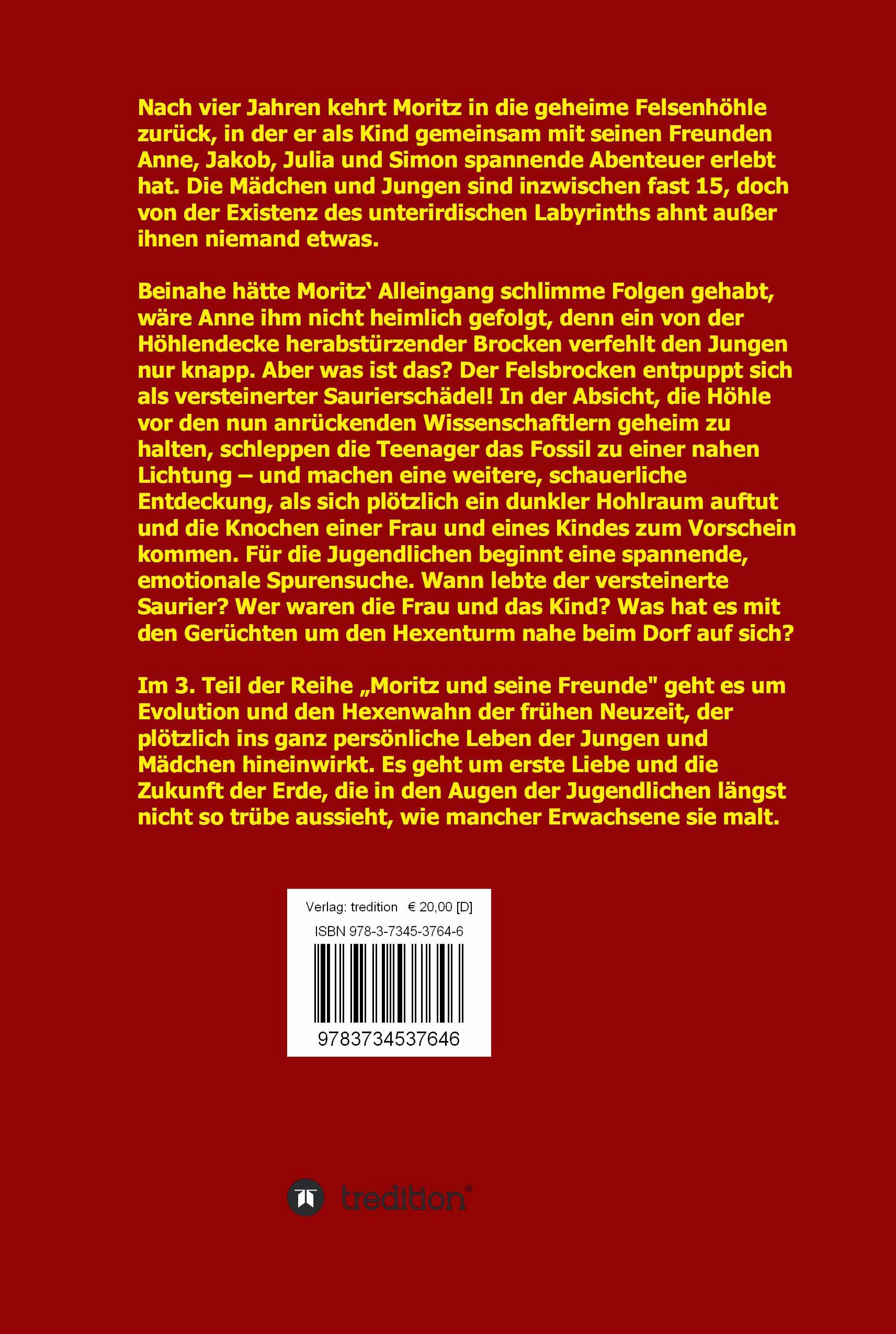 Nach vier Jahren kehrt Moritz in die geheime Felsenhöhle zurück, in der er als Kind gemeinsam mit seinen Freunden Anne, Jakob, Julia und Simon spannende Abenteuer erlebt hat. Die Mädchen und Jungen sind inzwischen fast 15, doch von der Existenz des unterirdischen Labyrinths ahnt außer ihnen niemand etwas.Beinahe hätte Moritz' Alleingang schlimme Folgen gehabt, wäre Anne ihm nicht heimlich gefolgt, denn ein von der Höhlendecke herabstürzender Brocken verfehlt den Jungen nur knapp. Aber was ist das? Der Felsbrocken entpuppt sich als versteinerter Saurierschädel! In der Absicht, die Höhle vor den nun anrückenden Wissenschaftlern geheim zu halten, schleppen die Teenager das Fossil zu einer nahen Lichtung - und machen eine weitere, schauerliche Entdeckung, als sich plötzlich ein dunkler Hohlraum auftut und die Knochen einer Frau und eines Kindes zum Vorschein kommen. Für die Jugendlichen beginnt eine spannende, emotionale Spurensuche. Wann lebte der versteinerte Saurier? Wer waren die Frau und das Kind? Was hat es mit den Gerüchten um den Hexenturm nahe beim Dorf auf sich?Im 3. und letzten Teil der Reihe "Moritz und seine Freunde" geht es um Evolution und den Hexenwahn der frühen Neuzeit, der plötzlich ins ganz persönliche Leben der Jungen und Mädchen hineinwirkt. Es geht um erste Liebe und die Zukunft der Erde, die in den Augen der Jugendlichen längst nicht so trübe aussieht, wie mancher Erwachsene sie malt.