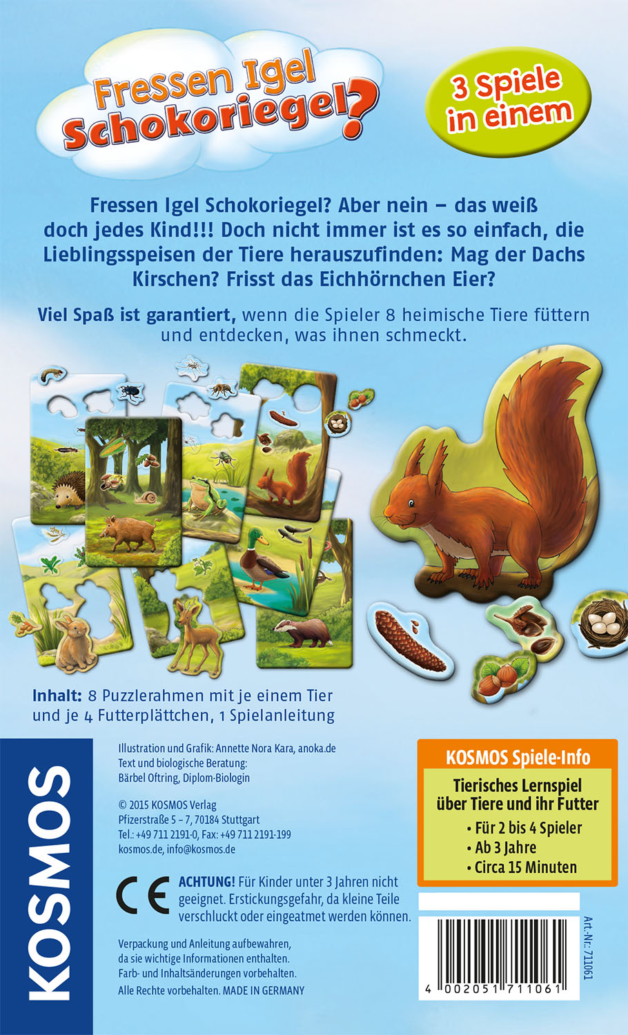 gt; Wissen über Tiere, ihre Lebensräume und was sie gerne fressen. > Mit Spielvariante für ältere Kinder ab 4/5 Jahren. Fressen Igel Schokoriegel? Aber NEIN!!! Das weiß doch jedes Kind - doch nicht immer ist es so einfach, die Lieblingsspeisen der Tiere herauszufinden: Fressen Eichhörnchen Eier? Fressen Enten Kräuter? Fressen Wildschweine Beeren? Jeder Spieler bekommt eine Tafel mit einem Tier. Wenn er an der Reihe ist, nimmt er sich ein Futterplättchen und versucht, das Plättchen in seine Tafel zu puzzeln. Die Puzzleausstanzung zeigt, ob das Futter zur Lieblingsspeise des Tieres gehört oder nicht. Wer als Erster seine Tafel mit vier Futterstückchen gefüllt hat, gewinnt. Mit Spielvariante für ältere Kinder ab 4/5 Jahren. Für 2 - 4 Spieler ab 3 Jahren. Spieldauer: ca. 15 Minuten.