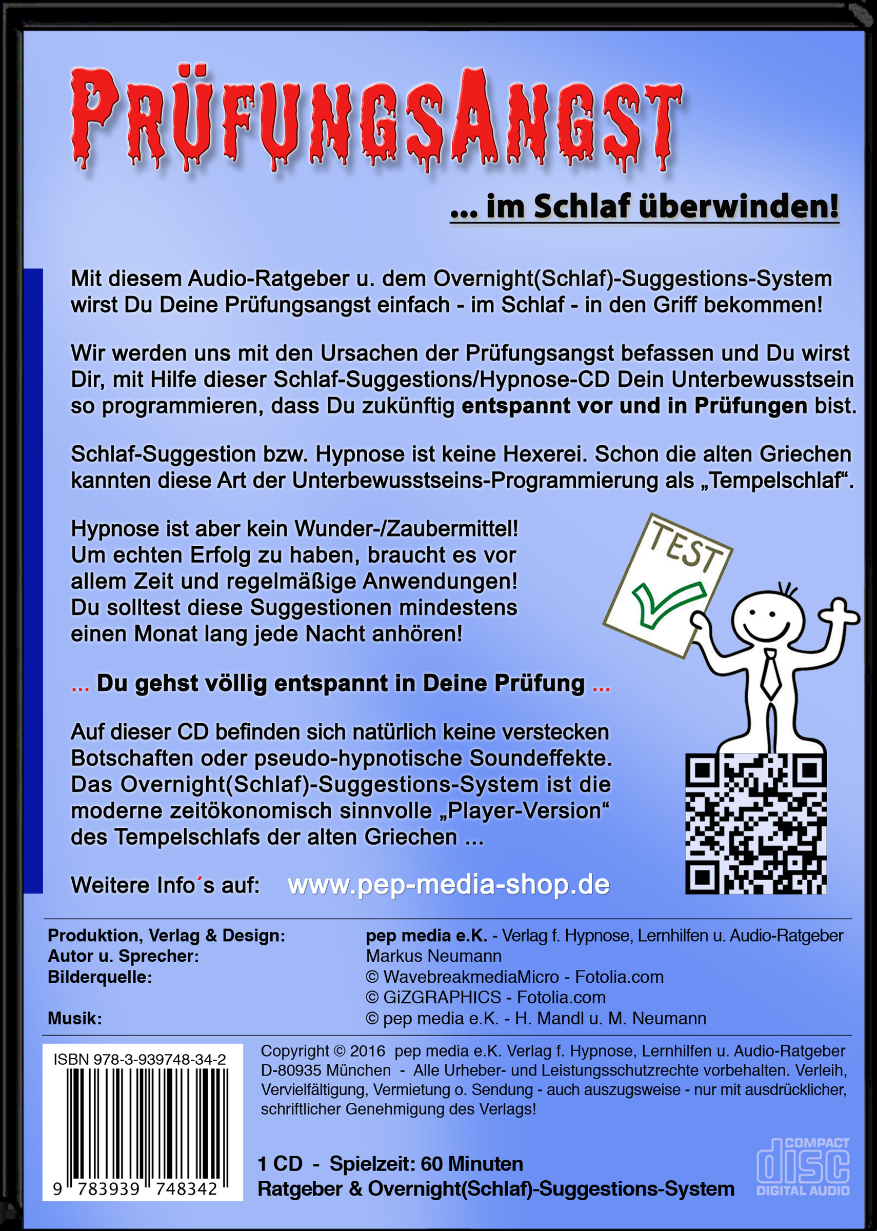 Du wirst Dir mit dieser CD ein neues von dir selbst gewünschtes Verhalten suggerieren. Du wirst deinem Unterbewusstsein einprogrammieren, dass du keine Angst vor Prüfungen mehr hast. Das Prüfungen keine Gefahren sind vor der man Panik haben muss.