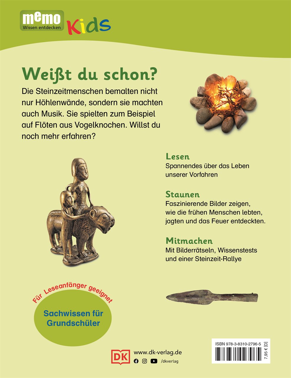 Wo lebten Neandertaler? Und wie ernährten sie sich? Welche Gefahren gab es in der Steinzeit? Diese und unzählige Fragen werden in kurzen, lebendigen Texten leicht verständlich beantwortet und mit faszinierenden Abbildungen aus dem Leben der ersten Menschen gezeigt. Die altersgerecht aufbereiteten Informationen sind für Leseanfänger einfach verständlich, so dass auch schwierige Zusammenhänge deutlich werden. Viele bunte Fotografien und Illustrationen veranschaulichen das Thema und helfen, das Gelesene zu begreifen. Wissenstests, Bilderrätsel und eine Steinzeit-Rallye regen zum Mitmachen an und vertiefen spielerisch das Gelernte. Ein Glossar am Ende des Buches erklärt schwierige Wörter und »Weißt du das?«-Kästen heben besonders interessante Fakten hervor. Durch die optimale Ausgewogenheit von Bild und Text ist »memo Kids - Die ersten Menschen« ideal zum Vor- oder Selberlesen geeignet. Wissen zum Sammeln: Alle memo Kids Bände sind nummeriert und sind mit einem durchgängigen Rückendesign gestaltet - so wächst mit jedem neuen Band im Bücherregal ein cooles Motiv mit! Dieses Buch ist bei Antolin.de verfügbar.
