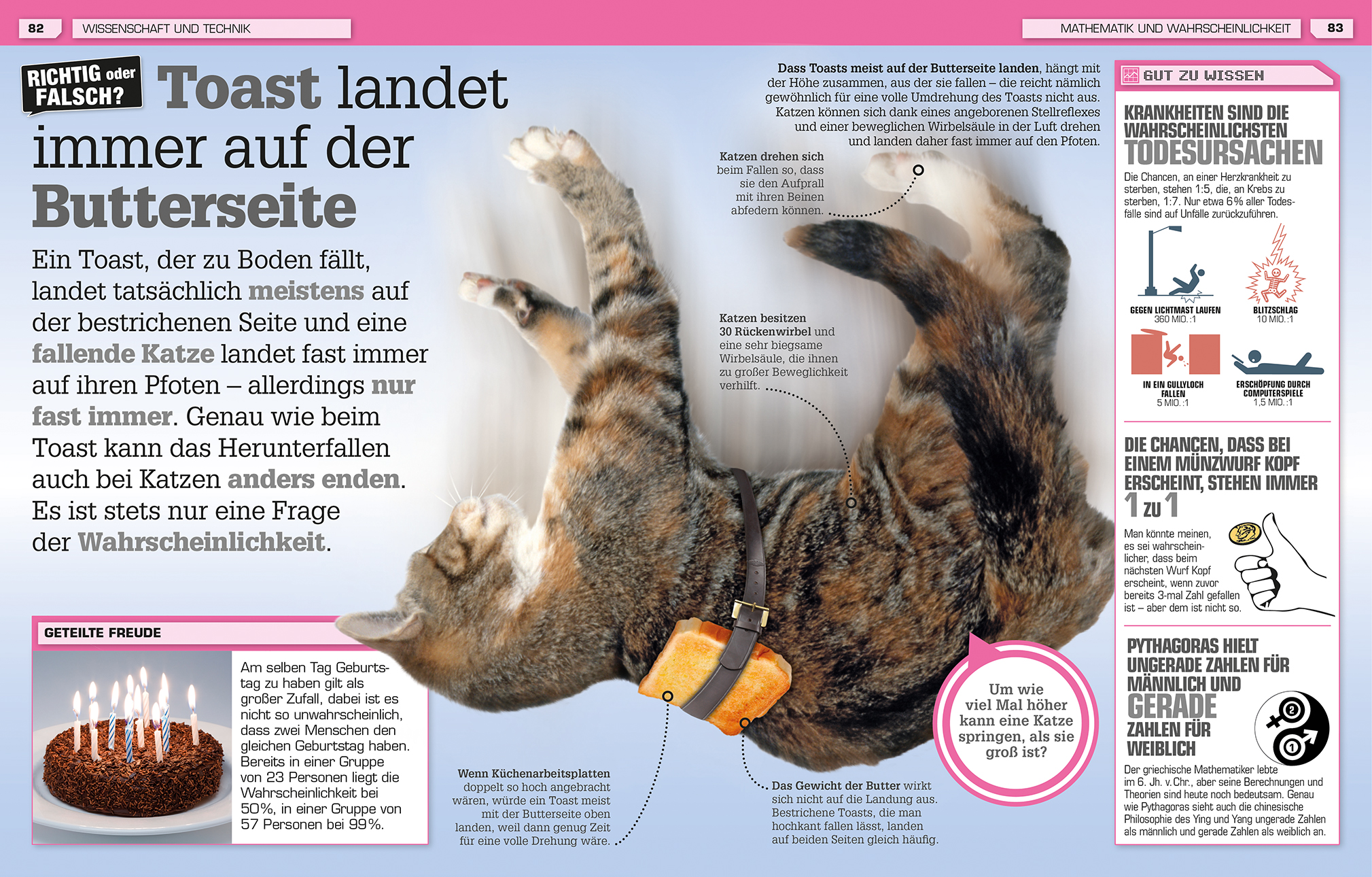 Jede Doppelseite beginnt dabei mit einer Behauptung, die dann auf ihren Wahrheitsgehalt hin überprüft wird. Stimmt es, dass ein tropfender Wasserhahn in einem Jahr 100 Badewannen füllt? Oder dass die Nervenzellen eines Menschen aneinandergereiht einmal bis zum Mond reichen? Die Antwort "Richtig oder falsch" wird ziemlich schnell in der Einleitung aufgedeckt und dann genauer ausgeführt.
