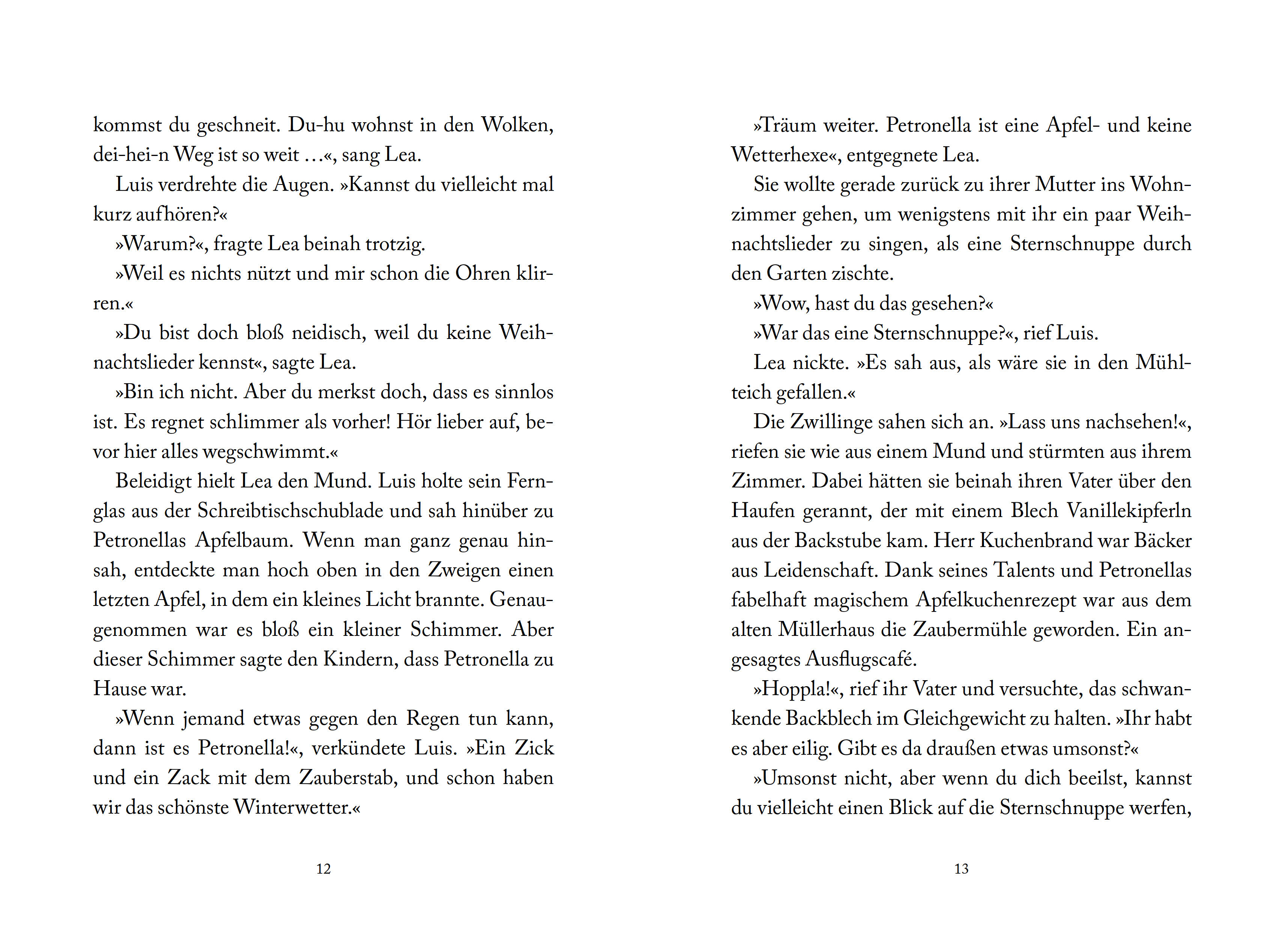 Während Lea und Luis sehnsüchtig auf den ersten Schnee warten, ist Petronella damit beschäftigt, ihren Apfel auf Vordermann zu bringen. Ihre Schwestern, die Wetterhexen, kommen zu Besuch. In all dem vorweihnachtlichen Trubel bemerkt keiner den seltsamen Gast, der sich in der Mühle einnistet. Der Weihnachtsmann hat den frechen Wichtel auf der letzten Probefahrt kurzerhand ausgesetzt. Jetzt sorgt er im Müllerhaus für reichlich Wirbel. Anfangs ahnt niemand, wer hinter den Streichen steckt. Alle verdächtigen sich gegenseitig und der Ärger ist vorprogrammiert! Zum Glück kommt Petronella rechtzeitig dahinter, wer da sein Unwesen treibt, und kann ein noch schlimmeres Chaos verhindern. Am Ende gibt es doch noch ein wunderbares Weihnachtsfest - inklusive Schnee. Drei Wetterhexen sei Dank!