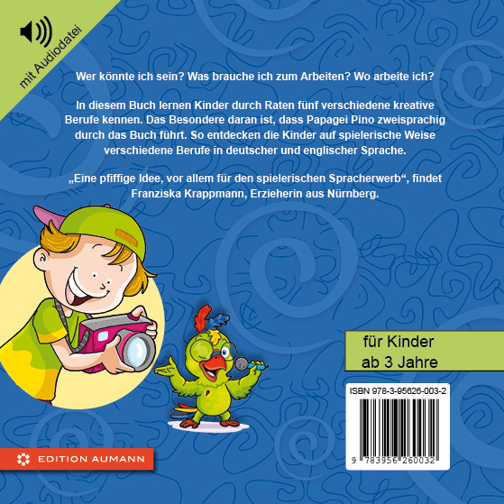Um diese und weitere Fragen dreht sich das Ratebuch zu Berufen, die mit Kreativität zu tun haben. Die Kinder können dabei anhand der Beschreibung von Papagei Pino in deutscher und englischer Sprache erraten, welchen Beruf die gesuchte Person ausübt, und auf diese Art auch für sie neue Berufe kennenlernen.