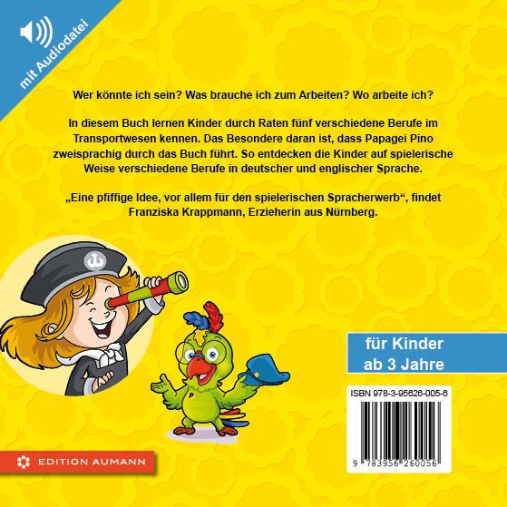 Um diese und weitere Fragen dreht sich das Ratebuch zu Berufen, die mit Transport zu tun haben. Die Kinder können dabei anhand der Beschreibung von Papagei Pino in deutscher und englischer Sprache erraten, welchen Beruf die gesuchte Person ausübt, und auf diese Art auch für sie neue Berufe kennenlernen. Die Neugier der Kinder und ihre spielerische Interaktion mit diesen Ratebüchern zielt darauf ab, das Lernen der Kinder zu stärken.