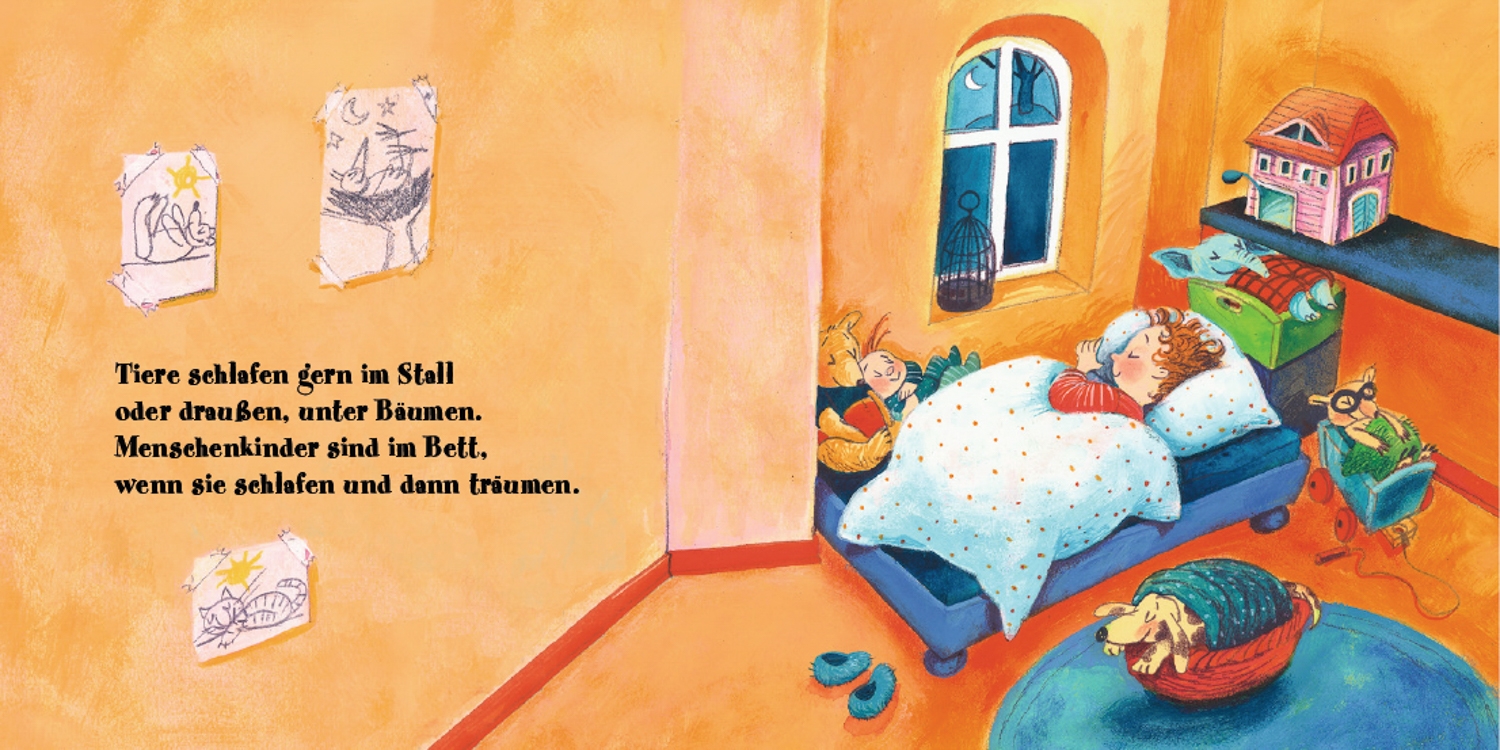 Schlafen Tiere eigentlich genauso wie Menschen? Manche schon, aber viele auch nicht! Die Fledermaus hängt sich zum Schlafen mit den Füßen an den Dachbalken, die Häschen kuscheln sich in ihren Bau, das Schäfchen schläft auf der Wiese bei seiner Mama und das Kälbchen liegt sicher und warm im Stall. Und wo träumen die Kinder am schönsten? Zauberhafte Reime vom Meister Paul Maar und liebevolle, lustige Bilder von Dagmar Geisler!