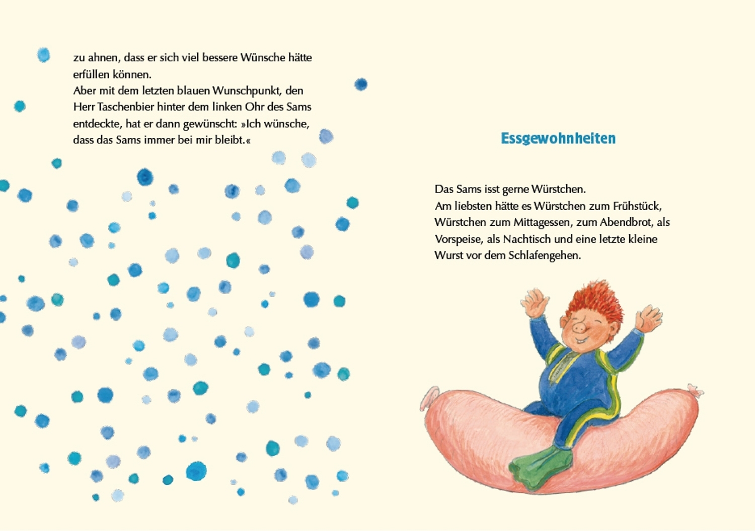 Wunschpunktalarm! Herr Taschenbier bekommt vom Sams zum Geburtstag ein besonders kostbares Geschenk: einen allerletzten Wunschpunkt. Doch was macht Herr Taschenbier? Wünscht sich natürlich das Falsche, nämlich ein Sams für seine nervige Nachbarin Frau Rotkohl. Und prompt sitzt an ihrem Esstisch ein zweites Sams! Das ist zwar furchterregend brav, aber es fordert das Taschenbier-Sams ganz schön heraus!