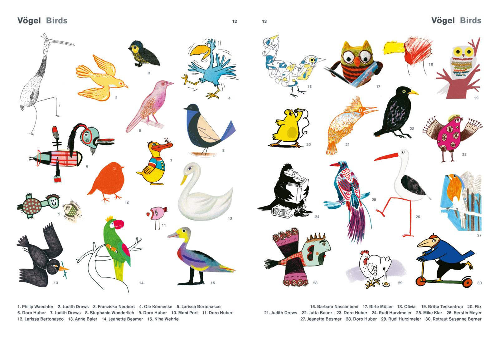 Beteiligt sind an diesem Band 60 der derzeit interessantesten deutschen Illustratorinnen und Illustratoren und vier Kinder: Monika Aichele, Anne Baier, Verena Ballhaus, Jutta Bauer, Rotraut Susanne Berner, Larissa Bertonasco, Jeanette Besmer, Franziska Biermann, Jens Bonnke, Nadia Budde, Judith Drews, Maria Eisenächer, Aisha Franz, Susanne Göhlich, Felix Görmann (Flix), Golden Cosmos, Constanze Guhr, Stefanie Harjes, Ina Hattenhauer, Nikolaus Heidelbach, Sybille Hein, Egbert Herfurth, Dorothea Huber, Rudi Hurzlmeier, Joëlle Jolivet, Norman Junge, Regina Kehn, Halina Kirschner, Mike Klar, Ole Könnecke, Vitali Konstantinov, Anke Kuhl, Yvonne Kuschel, Franziska Ludwig, Sophia Martineck, Kerstin Meyer, Gerlinde Meyer, Bernd Mölck-Tassel, Eva Muggenthaler, Jörg Mühle, Birte Müller, Thomas M. Müller, Barbara Nascimbeni, Franziska Neubert, Isabel Pin, Moni Port, Axel Scheffler, Marei Schweitzer, Katja Spitzer, Katrin Stangl, Britta Teckentrup, Karsten Teich, Philip Waechter, Franziska Walther, Nina Wehrle, Claudia Weikert, Sabine Wilharm, Stephanie Wunderlich, Franz Zauleck, Johann (9 Jahre), Olivia (6 Jahre), Frida Luzie (9 Jahre), Julie (9 Jahre) Herausgegeben von Jutta Bauer und Katja Spitzer