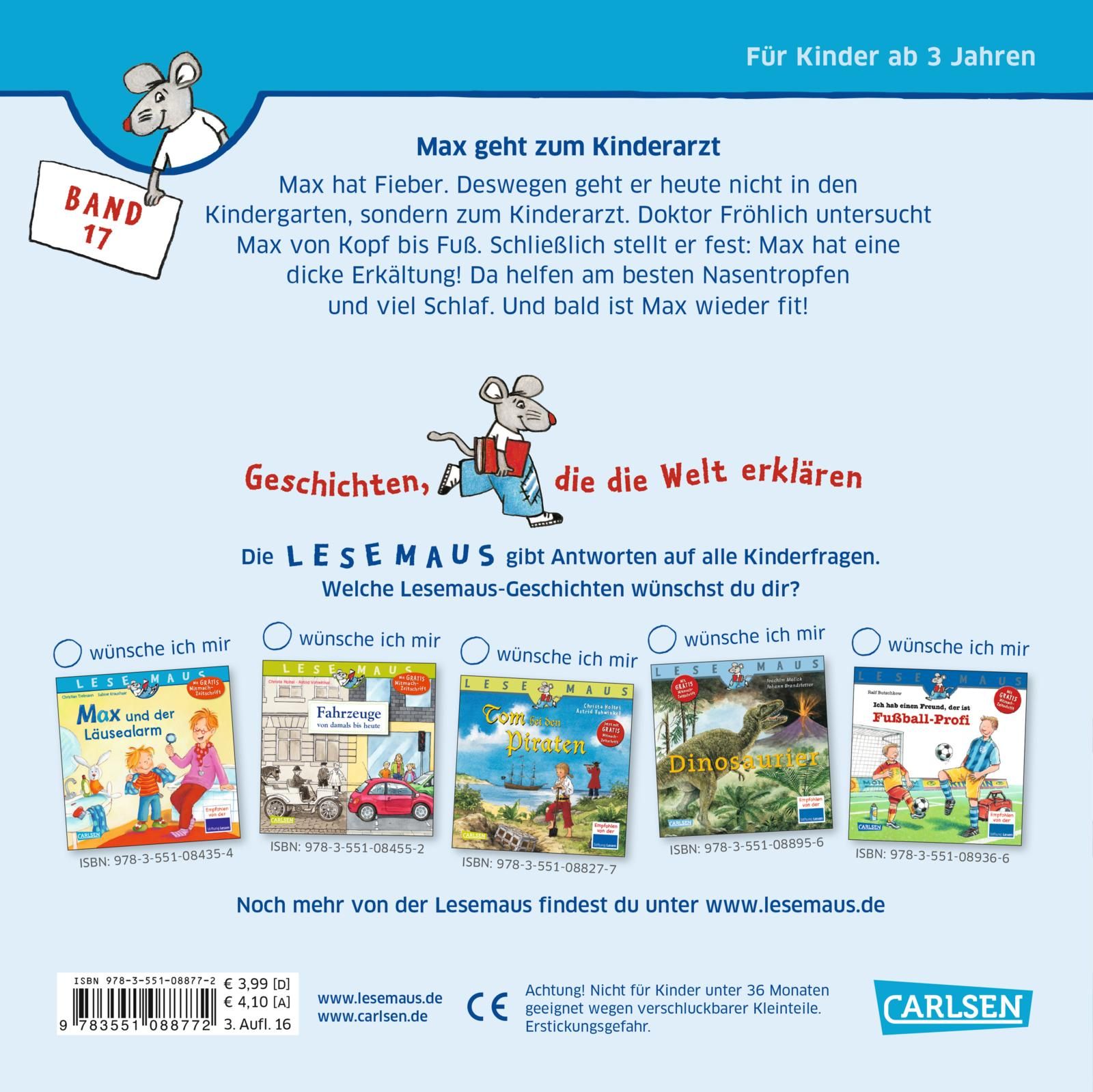 Max hat Fieber. Deswegen geht er heute nicht in den Kindergarten, sondern zum Kinderarzt. Doktor Fröhlich untersucht Max von Kopf bis Fuß. Schließlich stellt er fest: Max hat eine dicke Erkältung! Da helfen am besten Nasentropfen und viel Schlaf. Und bald ist Max wieder fit!