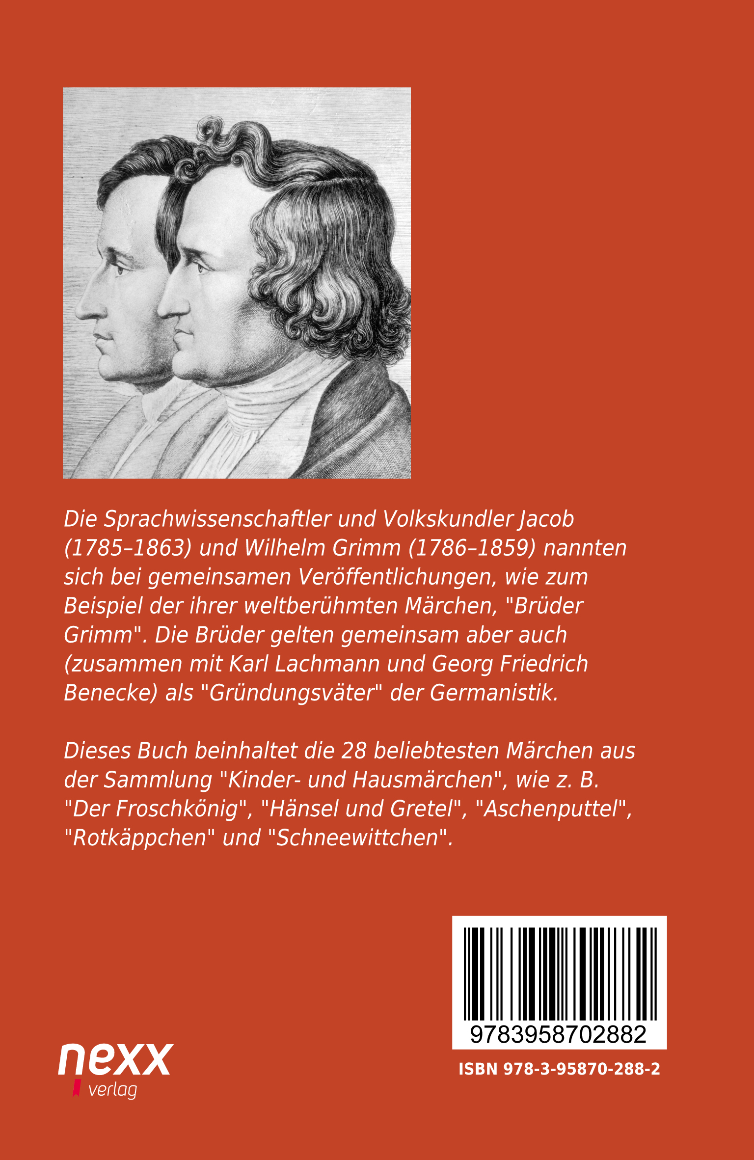 Dieses Buch beinhaltet die 28 beliebtesten und schönsten Märchen aus der Sammlung »Kinder- und Hausmärchen«, wie z. B. »Der Froschkönig«, »Hänsel und Gretel«, »Aschenputtel«, »Rotkäppchen« und »Schneewittchen«.