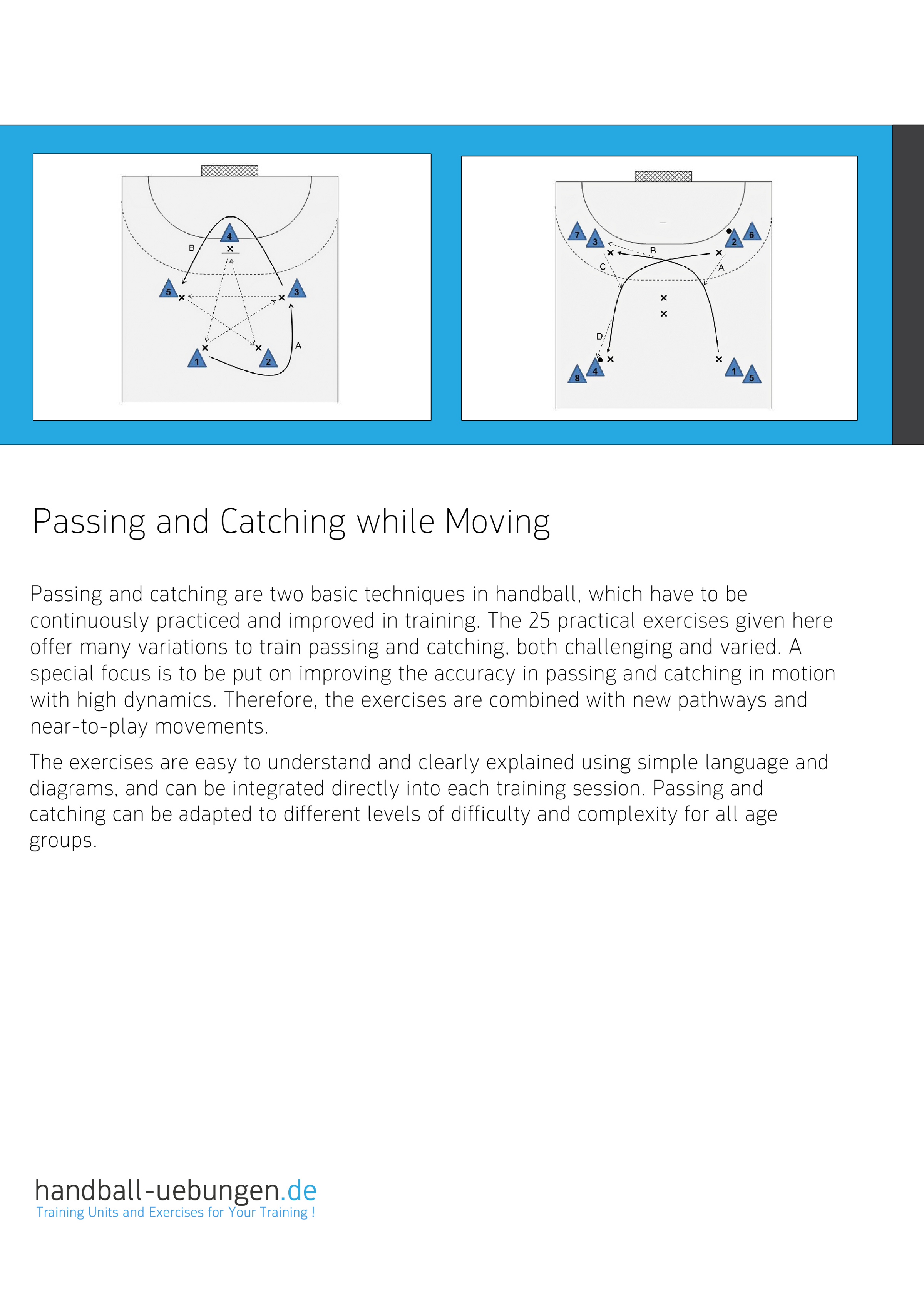 The exercises are easy to understand and clearly explained using simple language and diagrams, and can be integrated directly into each training session. Passing and catching can be adapted to different levels of difficulty and complexity for all age groups.