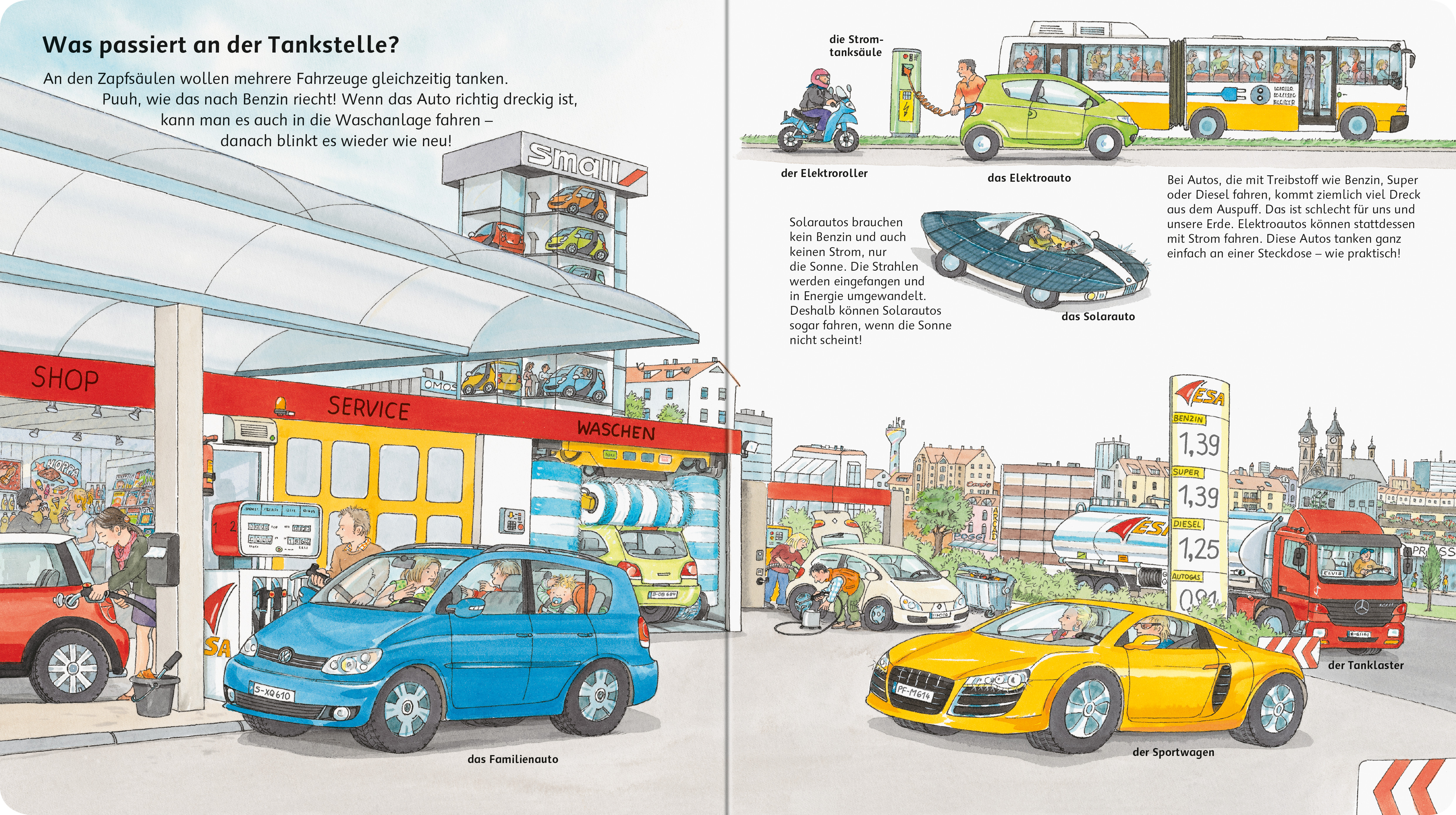 Im Inhalt finden sich die spannendsten Themen für kleine Fahrzeug-Spezialisten. Entdecke die Autobahn, den Flughafen, die Baustelle, verschiedene Traktoren, Einsatzfahrzeuge, die Müllabfuhr und die Autowerkstatt.