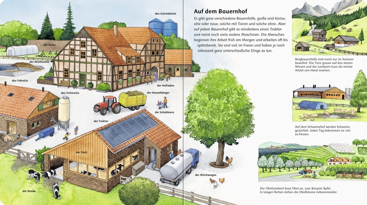 In diesem umfassenden Bilderlexikon können Kinder alles erfahren, was sie über den Bauernhof wissen möchten: Welche Tiere leben auf dem Bauernhof? Was wird angebaut? Wie wird geerntet? Wie sieht ein Kuhstall aus? Und vieles mehr.