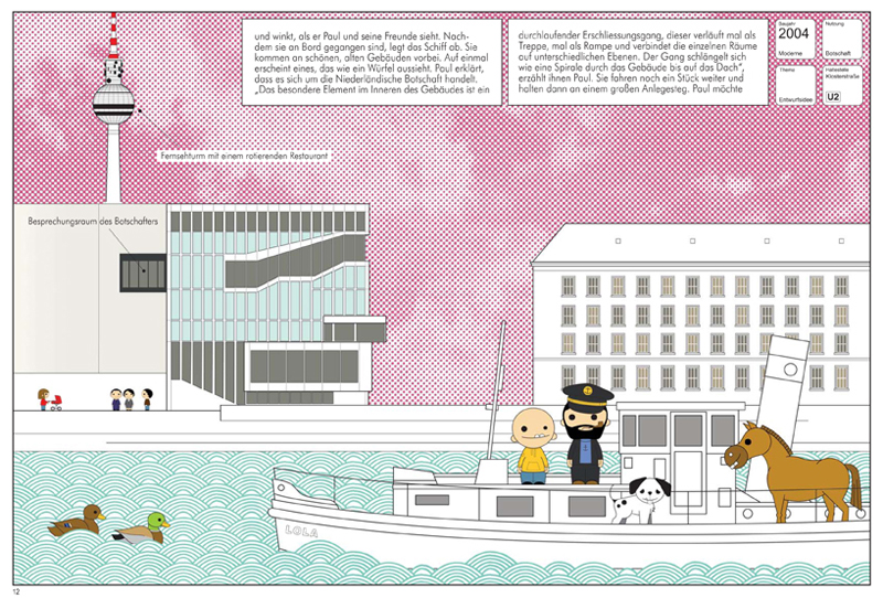 SCHINKEL BEAR CURRYWURST is an illustrated guide to the architecture of Berlin. The book is aimed at children and grown-ups with an interest in graphic design, urban history and architecture. Oscar and his dog Carla set off on an adventure to Berlin and discover interesting places. Assorted people from the city accompany them on their travels. Historic and contemporary architecture is introduced. Various subjects like architectural and graphic styles, design concepts and developments in urban planning are explained for children through detailed illustrations and short texts. The authors, Claudia Stolte and Volker Schultz, are architects and urban planners from Berlin.