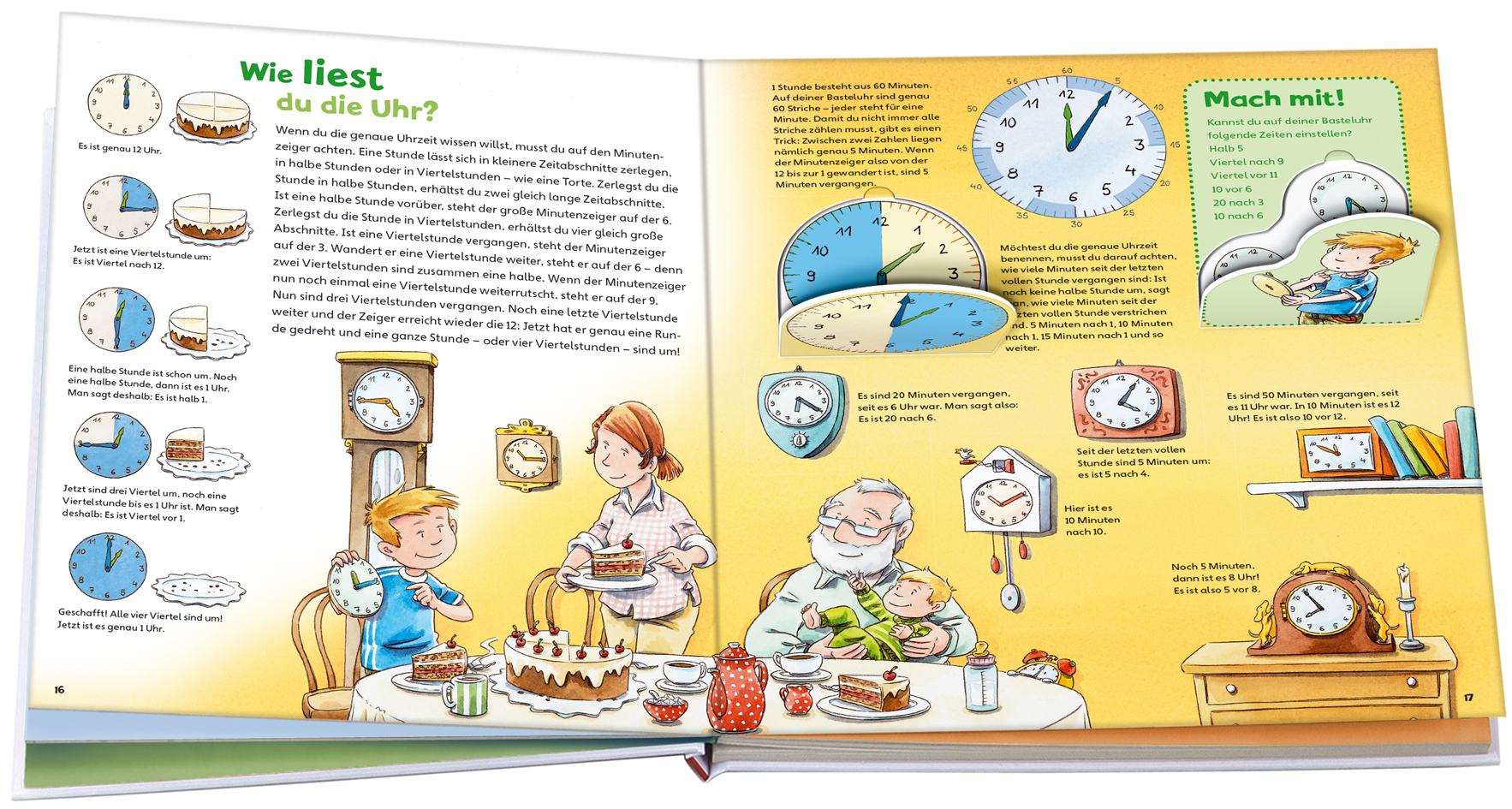 Uhr, Zeit und Uhrzeit sind die Themen in diesem Uhrenbuch für Kinder ab 4 Jahren. Die ihnen zunächst eher abstrakt erscheinenden Begriffe werden anhand ihres Alltags zerlegt und wieder zusammengefügt: zu Stunden, Wochentagen, Monaten, der Zeit zwischen zwei Geburtstagen, Jahreszeiten, Gegenwart und Zukunft ... Mit Uhr zum Selberbasteln und Üben, Entdecker-Klappen, Rätseln und Spielen.
