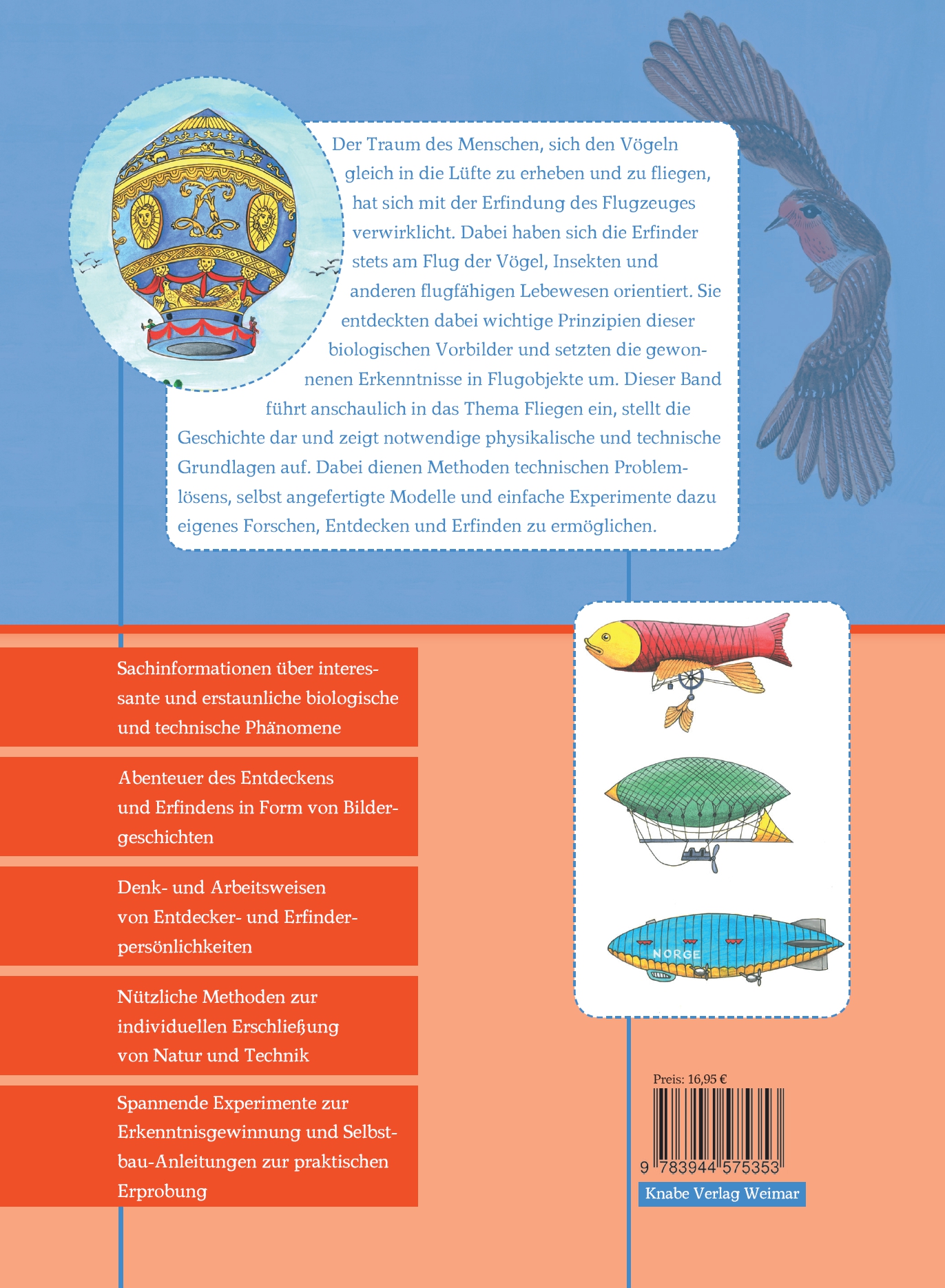 Der sechste Band unserer Sachbuchreihe "Bionik" führt anschaulich in das Thema Fliegen ein, stellt seine Geschichte dar und zeigt notwendige physikalische und technische Grundlagen auf. Methoden technischen Problemlösens, selbst angefertigte Modelle und einfache Experimente sollen auch in diesem Band wieder zum eigenen Forschen, Entdecken und Erfinden anregen.