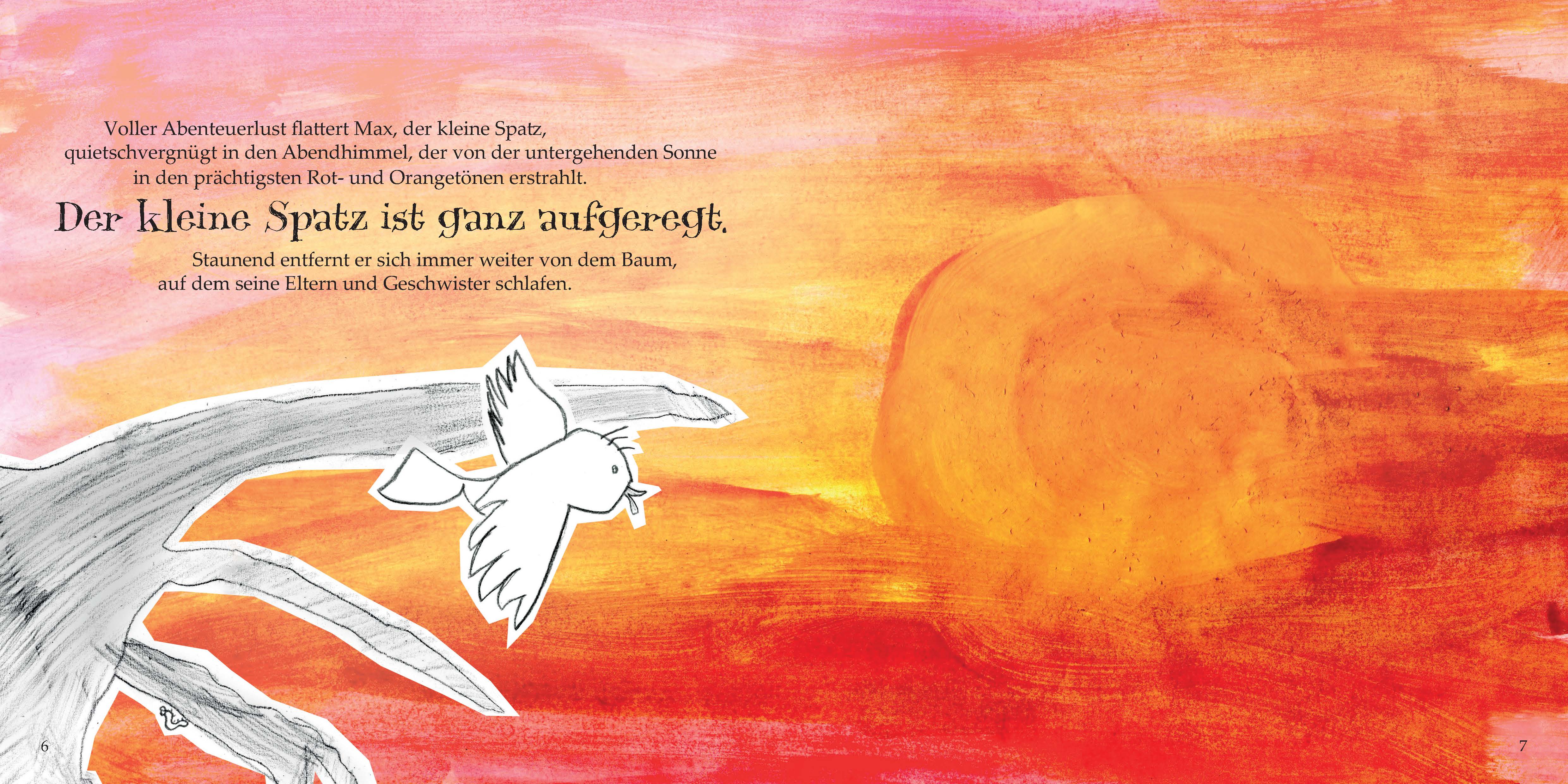 piepst der kleine Spatz Max und fliegt voller Abenteuerlust in den leuchtenden Sonnenuntergang. Doch bald hat dieser sich in einen schwarzgrauen Nachthimmel verwandelt. Der kleine Spatz muss erfahren, dass er nicht überall willkommen ist und die Nacht ihre eigenen Gesetze hat. Wenn er doch nur den Baum mit seinen Eltern wiederfinden würde ...