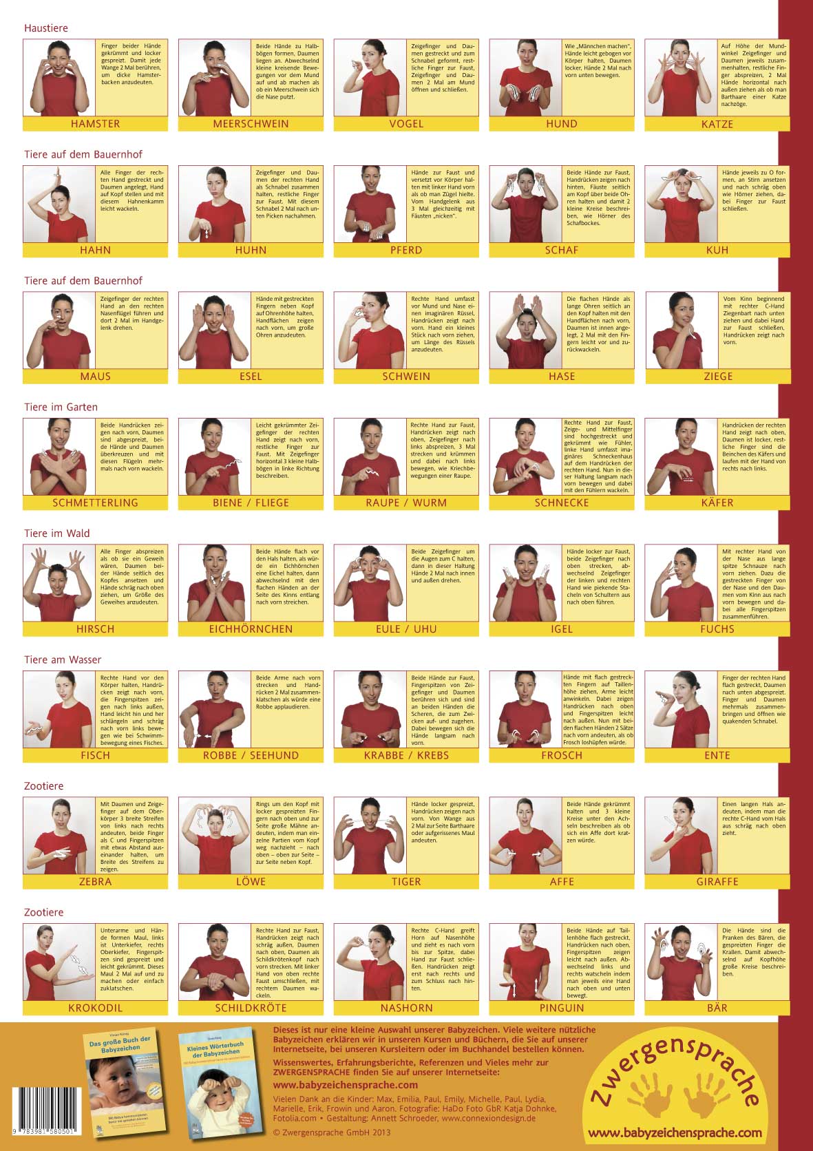 | Schlagworte | Baby • Babygebärden • BabyHandzeichen • Baby Signs • Babysprache • Babys Zeichensprache • Babyzeichen • Babyzeichensprache • Bilderbuch Tiere • DGS • Down-Syndrom • Eltern Kind Kurs • Fingerspiele • Frühförderung • Gebärden • Gebärdensprache • Geschwister • GuK • Handzeichen • Inklusion • Kindergebärden • Kinder verstehen • Kita • Kommunikation • Krabbelgruppe • Krippe • Krippenkind • lautsprachbegleitende Gebärden • Logopädie • Mehrsprachigkeit • Nonverbale Kommunikation • Poster (Papeterie) • Spielgruppe • Sprache • Spracherwerb • Sprachförderung • Sprechen lernen • Tagespflege • Unterstützte Kommunikation • Verständigung • Zwergensprache |