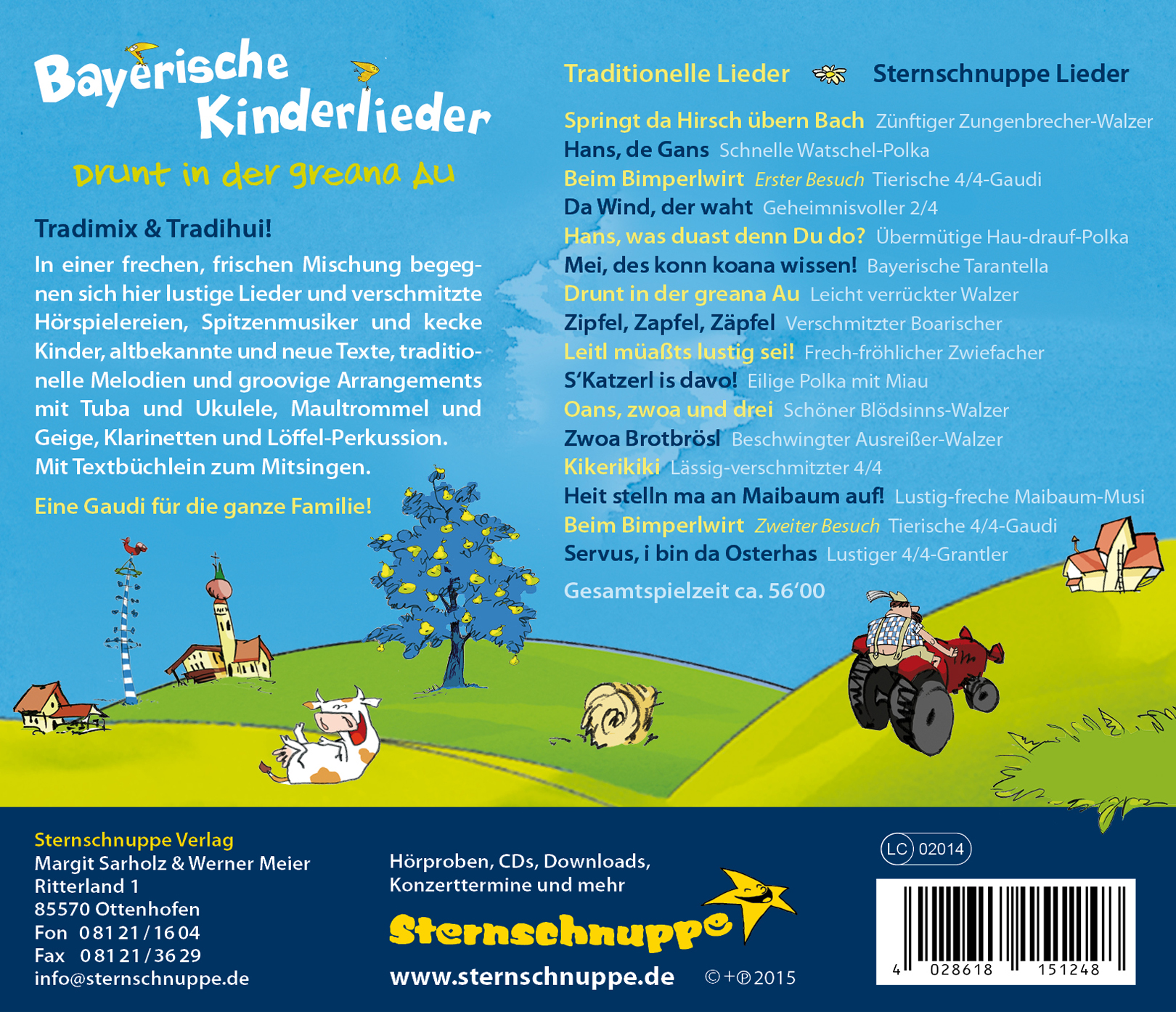Auf vielfachen Wunsch ihrer bayerischen Fans und weil es die beiden kreativen Köpfe 'hoit einfach aa gfreit', dreht sich ihre neue Sternschnuppe-CD rundherum um bayerische Kinderlieder - lustige, traditionelle Lieder und neue, frischgeschriebene Sternschnuppe Lieder in einer quirlig-bunten Mischung und im frechen Tradimix-und-Tradihui-Stil der neuen bayerischen Volksmusik.