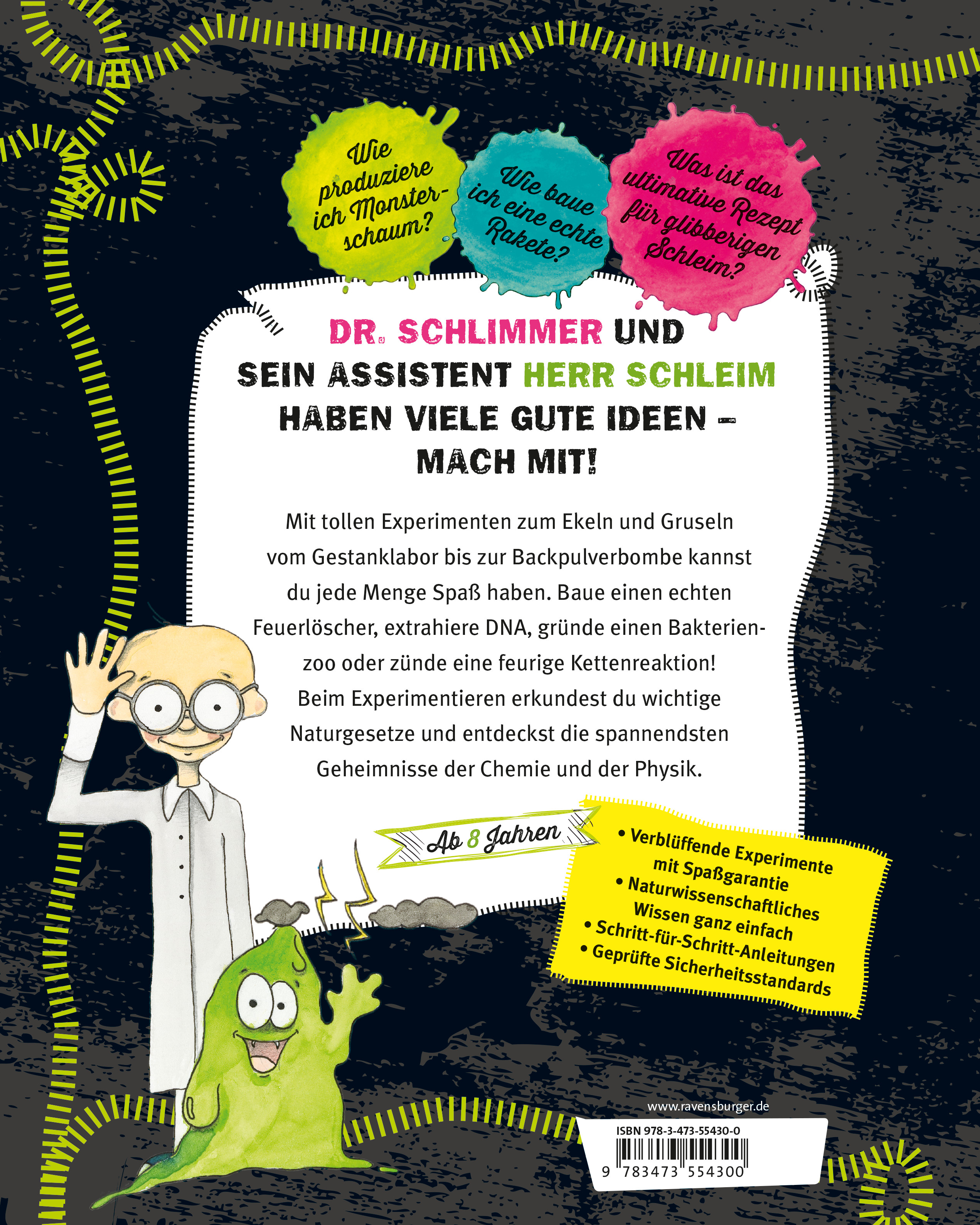 Dieses Buch bietet Experimente mit Gelinggarantie. Nachwuchsforscher basteln eine Brausepulverrakete, erkunden die Geheimnisse des Hefeteigs oder bringen eine Energiesparlampe ohne Strom zum Leuchten. Dabei lernen Sie jede Menge über naturwissenschaftliche Zusammenhänge und Phänomene (Stichwort MINT-Bildung) kennen, etwa wenn sie eine nicht-newtonsche Flüssigkeit anrühren, die DNS einer Banane extrahieren oder einen Wirbelgleiter basteln. Dr. Schleim, das durchgeknallte Universalgenie, und sein kleiner grüner Assistent Schleim sorgen dafür, dass die Leser dabei jede Menge Spaß haben.
