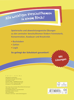 Kinder ab 5 Jahren finden in diesem extradicken Block mit verstärktem Rücken viele Buchstabenrätsel, Suchbilder, Schreibübungen zu Zahlen und Buchstaben sowie erste Leseübungen.