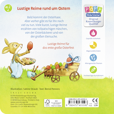 | Schlagworte | Eier bemalen • Eier-Suche • erste Rituale • Feste • Geschenk-Buch • Kinder-Reim • Kinderreime • Kinderreime; Bilderbuch • Kinderreime; Bilderbuch (unzerr.) • Klein-Kind • Mitbingsel • Oster-Feuer • Osterhase • Ostern • Ostern; Bilderbuch • Ostern; Bilderbuch (unzerr.) • Ostertitel • Papp-Bilderbuch • Tier-Kind |