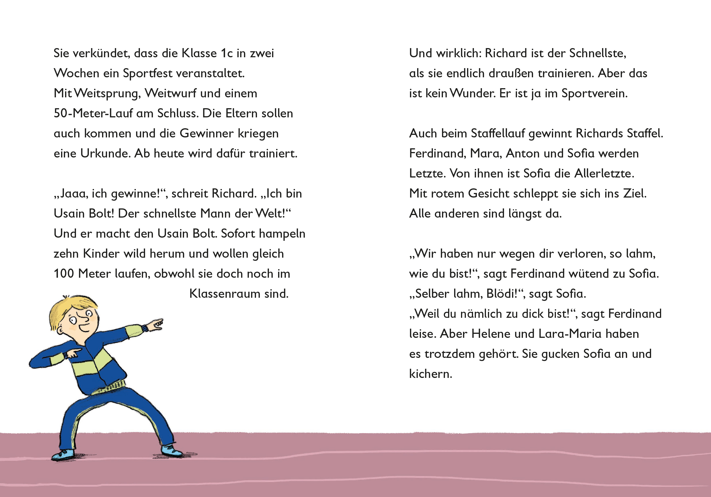 Als Frau Schrock das Sportfest für die Klasse 1c ankündigt, freut Richard sich schon auf den Siegerpokal. Andere Kinder sind nicht so begeistert. Deshalb denken sich Anton, Selin und ihre Freunde mal wieder etwas Besonderes aus.
