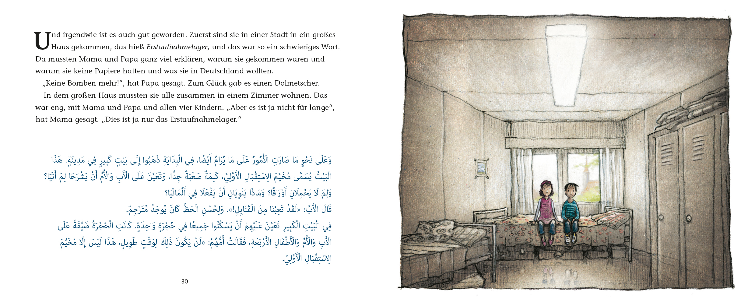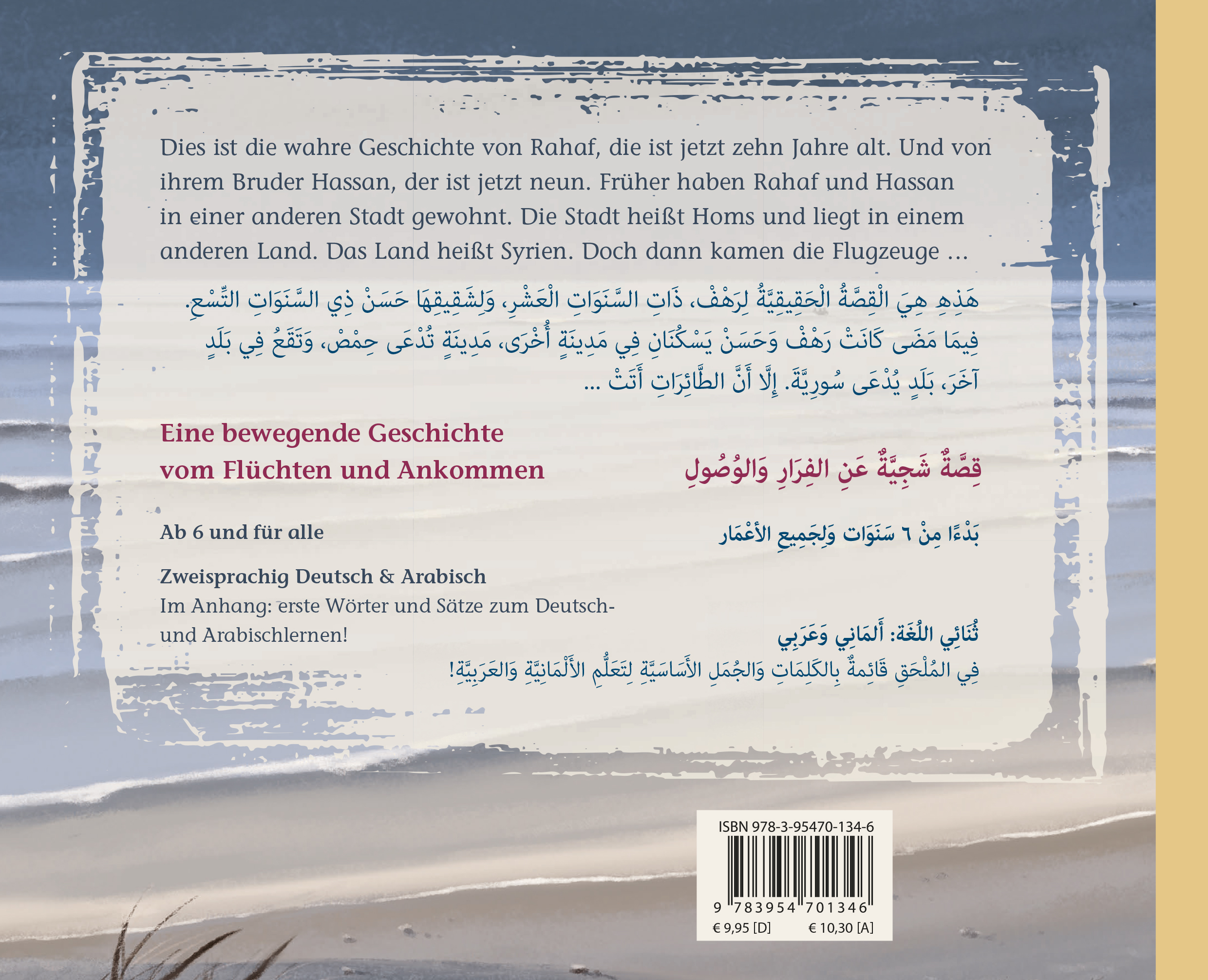 Wir bringen diese bewegende Geschichte zweisprachig heraus, damit viele Flüchtlingskinder sie in ihrer Sprache lesen können. Außerdem hilft ein kleiner Sprachführer im Anhang beim Deutsch- und Arabisch-Lernen. Jan Bircks Bilder begleiten den knappen Text auf eindrückliche und warmherzige Weise.