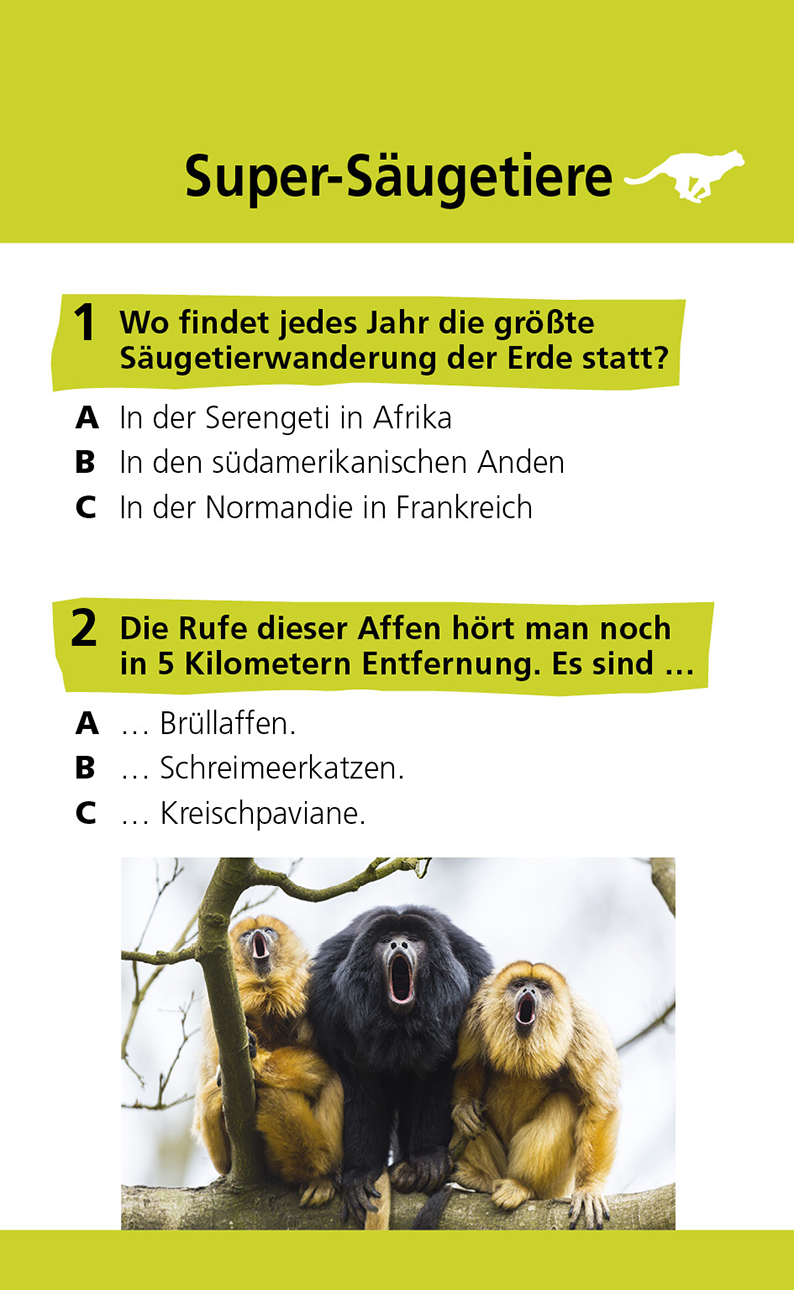 Mit diesem Quiz können Kinder bei Frage-Antwort-Rätseln ihr Wissen rund um das Thema "Tierrekorde" testen. Auf insgesamt 96 spannende Fragen bekommen sie im memo Quiz verblüffende Antworten. Zu jeder Frage stehen drei mögliche Antworten zur Auswahl - die richtige Lösung verbirgt sich auf der Rückseite! Darüber hinaus gibt es interessante Zusatzinfos und leicht verständliche Erklärungen. Für echte Durchblicker werden besonders knifflige Fragen gestellt. Jede richtige Antwort wird mit Punkten belohnt. So kann man alleine rätseln und den eigenen Wissensstand testen oder mit Geschwistern und Freunden spielen und vergleichen, wer sich besser auskennt.