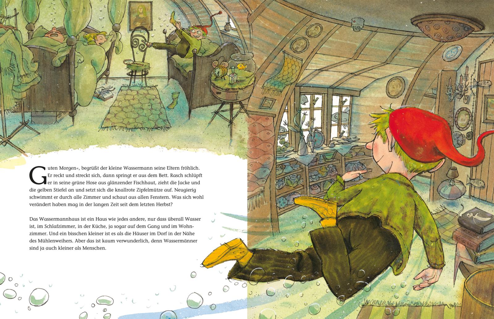 Es wird Frühling und der kleine Wassermann macht sich nach einem langen Winterschlaf auf den Weg, um das ganze Jahr über viele kleine und große Abenteuer zu erleben. Er besucht alle seine Freunde im Mühlenweiher, legt sich im Sommer mit dem Müller vom Mühlenweiher an und feiert ein großes Wassermann-Sommerfest. Im Herbst erlebt er ein großes Abenteuer, als er alleine mit dem Floß auf den großen Bach hinausfährt. Es wird wieder Winter und der kleine Wassermann kuschelt sich in sein Bett, um bis zum nächsten Frühling tief und fest zu schlafen.