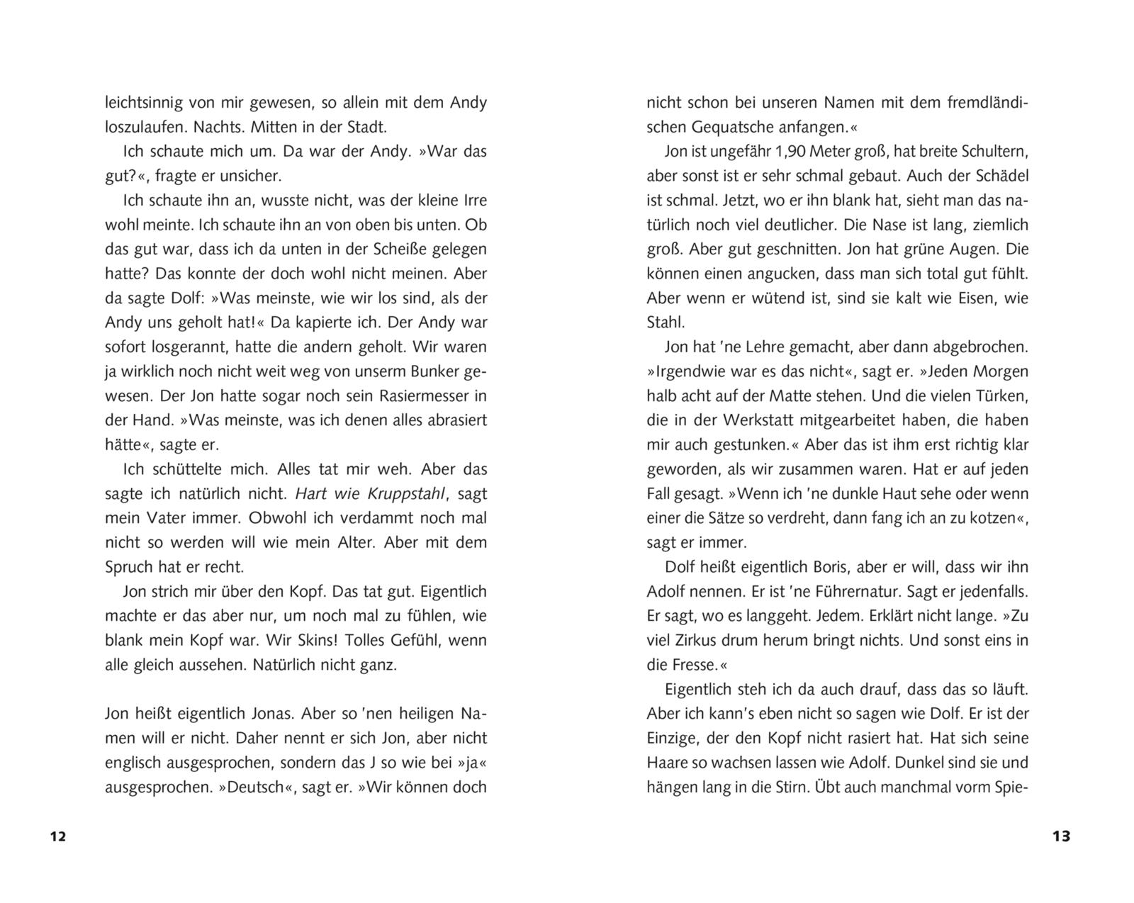 | Schlagworte | Antolin (ab 9. Klasse) • Die Welle • Flüchtlinge • Gewalt • Gewalt; Kinder-/Jugendliteratur • Jugendbuch • Kinder, Jugendliche und Bildung • Klassische Romane und Erzählungen (Kinder/Jugendli • Neonazi • Rassismus • Rechtsradikalismus; Kinder-/Jugendlit. • Romane, Erzählungen und wahre Geschichten (Kinder/ • Romane und Erzählungen allgemein (Kinder/Jugendlic • Skin • Skinhead |