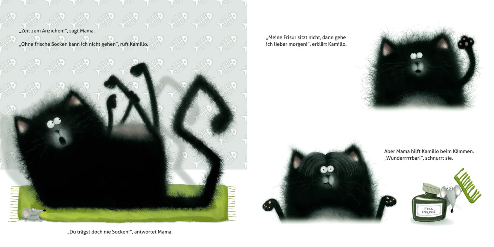 Kater Kamillo, die felligste und schwärzeste Katze der Welt, hat ein kleines bisschen Angst vor dem ersten Schultag. Aber alle Ausreden helfen nichts und so packt er schließlich seine Käse-Brotdose, schmuggelt Mäusefreund Hugo mit hinein und lässt sich von Mama zur Schule begleiten. Dort erwarten ihn nicht nur seine Lehrerin und viele andere Schulkatzenkinder, es gibt auch ganz Erstaunliches zu lernen ...