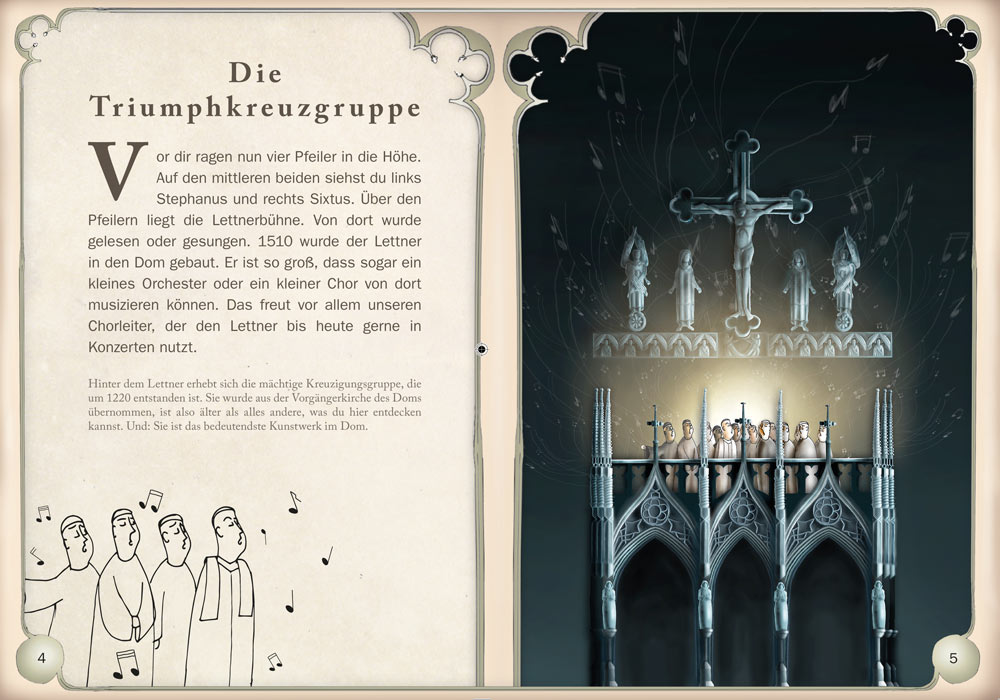Ein Dom ist ein Ort zum Staunen. Mannigfaltige Entdeckungen kann man hier machen und viele Fragen tun sich auf bei großen wie bei kleinen Besuchern. Da ist es gut, wenn man auf besonders Bemerkenswertes hingewiesen wird und Erklärungen dafür bekommt. 250 Jahre lang hatten Generationen von Handwerkern an der Bischofskirche zu Halberstadt gebaut, ehe sie am 28. August 1491 geweiht werden konnte. Dieser Domführer nimmt besonders die kleinen Gäste gewissermaßen bei der Hand und lenkt ihre Aufmerksamkeit zunächst auf das Taufbecken, den Altar, die Lettnerbühne sowie die aufstrebenden vier Pfeiler, wo man die Namensgeber des Gotteshauses sehen kann: die Heiligen Stephanus und Sixtus. Die Aussagen bedeutender Kunstwerke wie etwa der imposanten Kreuzigungsgruppe werden kindgemäß erklärt, ebenso Begriffe wie Domkapitel, Ökumene oder Reliquie. Der berühmte Domschatz wird erläutert, auch die Fenster der Marienkapelle mit ihrem Bildprogramm und die beeindruckenden Bildteppiche sowie Kanzel und die vierstöckige Orgel. Die liebevollen Illustrationen unterstützen das Gesagte, befördern die Orientierung vor Ort und bekräftigen die Einladung zum Besuch eines der sehenswertesten Kulturdenkmale im mitteldeutschen Raum.