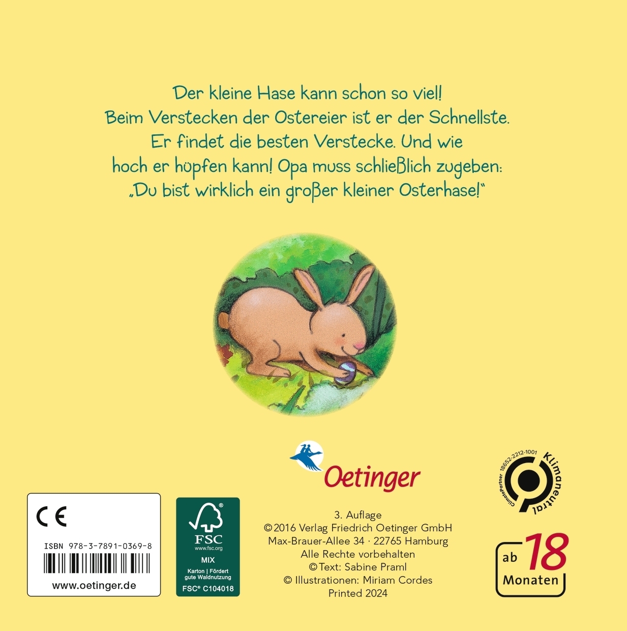 | Schlagworte | Bilderbuch • draußen • Fest • Frühling • Frühling Bilderbuch • Frühlingswiese • gereimtes Pappbilderbuch • Geschenk Osternest • Hase • Kinderbuch • Kinderbuch ab 1 • Kinderreime • Kleinkinder fördern • Natur • Opa • Ostereier • Osterfest • Ostergeschenk • Ostergeschichte • Osterhase • Osterhase; Bilderbuch • Osterhase; Bilderbuch (unzerr.) • Osterkorb • Ostern • Ostern; Bilderbuch • Ostern Geschichten • Pappbilderbuch • Papp-Bilderbuch • Reime • Selbstvertrauen stärken • Tiere • Tierkinder • Verstecken |
