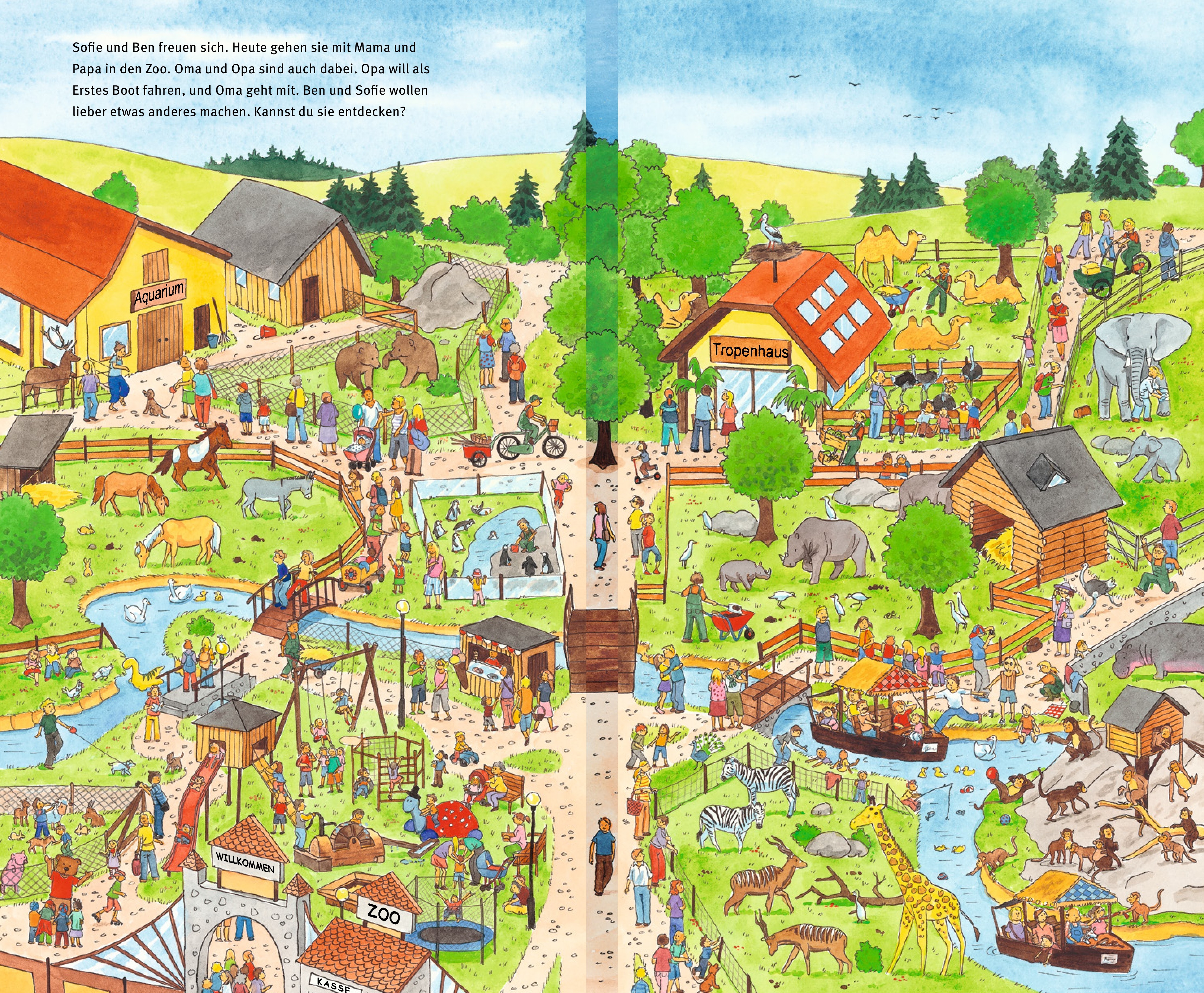 Sofie und Ben besuchen mit ihren Eltern und Oma und Opa den Zoo. Wie schon in den vorangegangenen Büchern gibt es auch hier wieder viele spannende und lustige Sachen zu entdecken. Die Kinder unternehmen eine Bootsfahrt entlang der Tiergehege, bestaunen die Affeninsel und wandern im Tropenhaus umher. Natürlich sind die eingeführten Figuren aus den ersten beiden Bänden wieder dabei.