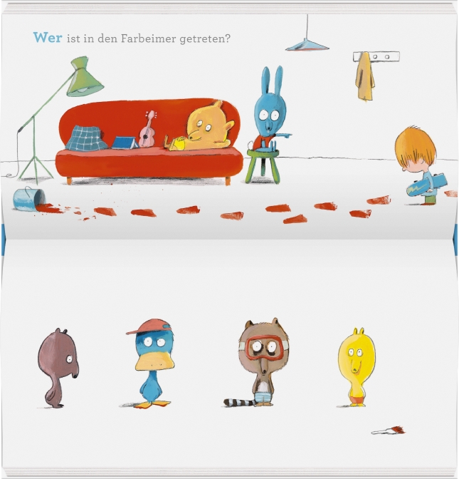 Wer ist in den Farbeimer getreten? Der Waschbär mit der Taucherbrille? Oder der gelbe Typ mit der roten Hose? Und wer hat seine riesigen Pantoffeln vergessen? Dem Streifentier sind sie bestimmt zu groß. Ob sie dem brummigen Eisbären passen? Oje, und wer ist beim Trampolinspringen halb aus dem Buch herausgeflogen? Wer genau hinguckt, findet auf jeder Doppelseite den Gesuchten - und entdeckt viele andere witzige Details.